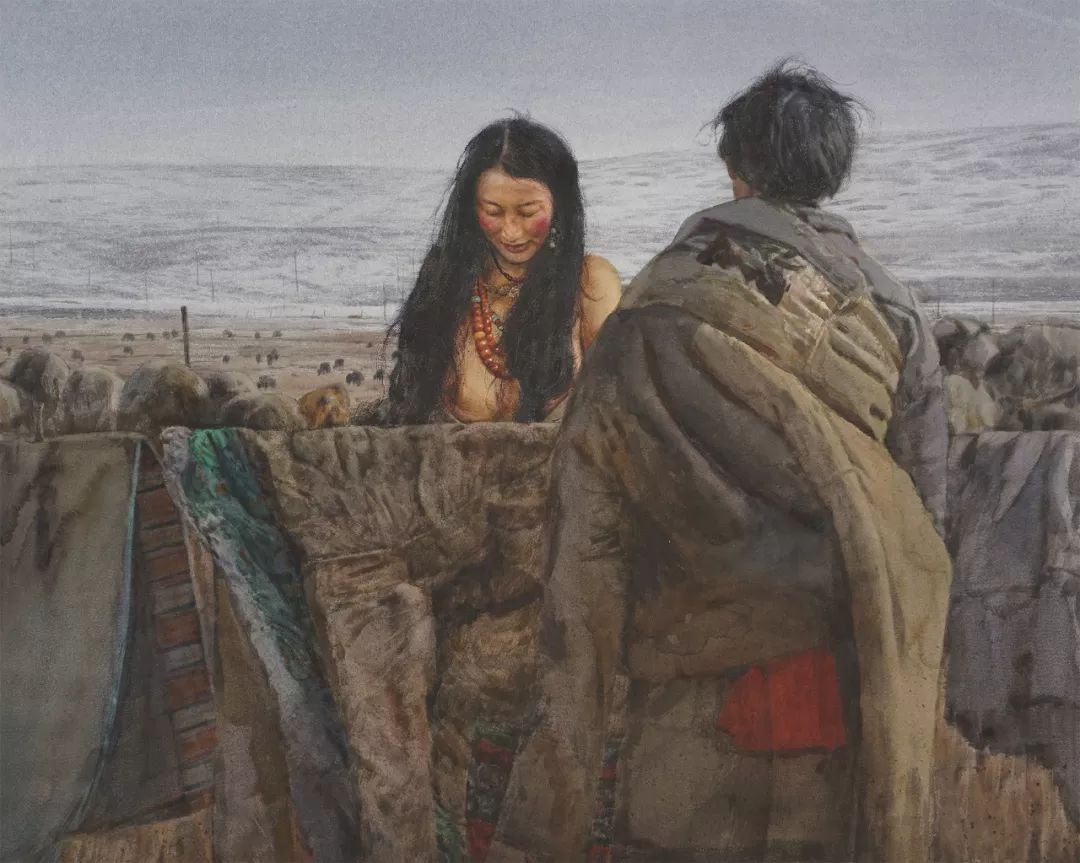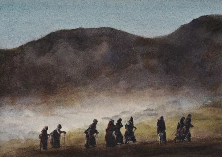 我的多幅作品都取材于桑科草原,這里的風景神秘壯美,這里的人民質樸純真,這里的文化豐富多元,這片雪域高原就是我靈魂的棲息地、心靈的原鄉。我的作品《小扎西》、《天邊的紅云》、《高原暖陽》等等講述的都是桑科草原的故事。水彩作品《小扎西》描繪的是桑科草原紛飛冬雪中,小扎西伴著擠奶的母親,背后是純凈天空和空靈遠山。由于我專注于歐洲文藝復興早期繪畫,尤其是丹培拉的研究和實踐,利用丹培拉親水親油的特殊性,將水性材料和油彩繪畫語言相互嫁接,重構新的繪畫語言和表現形式。在作品《小扎西》的創作中進行了創新實踐,丹培拉促進形象的塑造,對人物進行深入刻畫,除保留水彩畫本體語言,還大膽運用歐洲古典主義的寫實手法,突出小扎西那純真無邪的眼神和母親寬厚溫暖的身影。在創作時,我在技術和材料上重復渲染、疊加甚至不斷否定,再建構,再深入,每一步借由手的運作通達心靈的深層,每一次的否定都激發內心的沖動。使得創作由一種物質層面、外在的“像”走向精神層面的內在訴求。