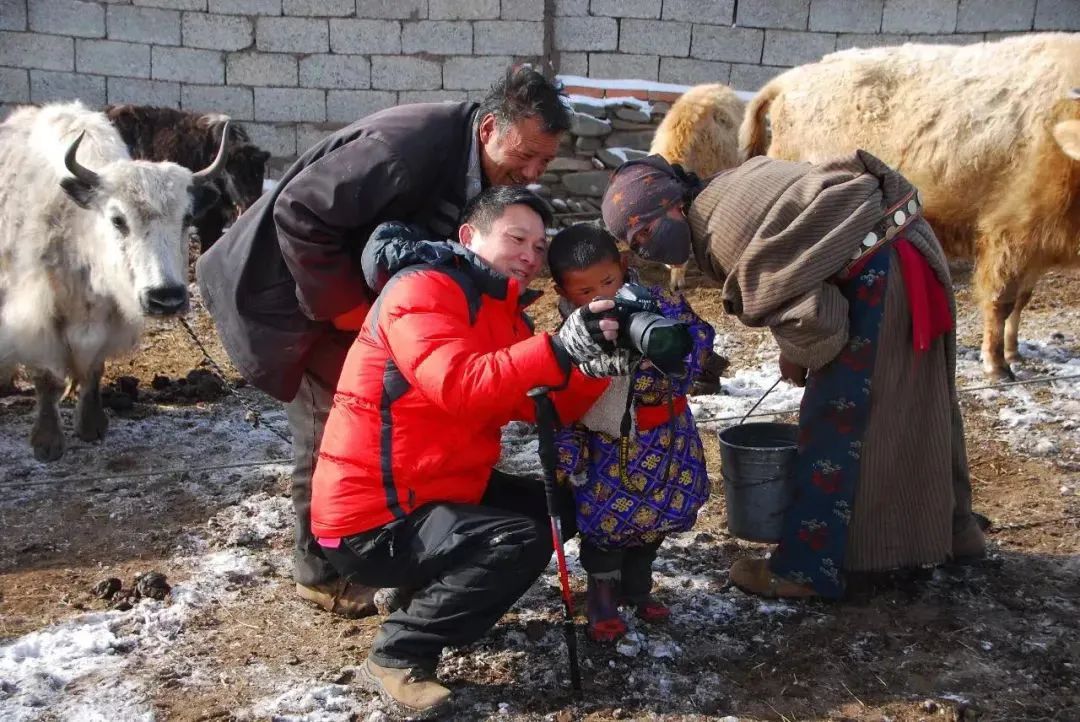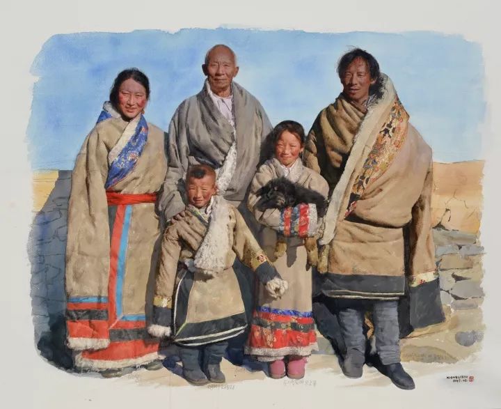 這次采風,我還有一個心愿,就是要再尋至格則小朋友一家。至格則小朋友和他的家人,是我多幅作品的創作原型。我的《高原之家》刻畫的就是至格則全家和小黑狗。至格則和媽媽拎著銅壺,在石墻下梳洗著頭發。我趕緊用畫筆速記下這充滿溫情的一幕,創作了《高原暖陽》和《高原午后》。這次我帶著小禮物還有我和至格則一家祖孫三代的合影,專程來到至格則家,不料,只見雜草叢生的小院和空空如也的牧房,至格則和小姐姐的笑聲、小黑狗撒歡兒的蹦跳......往日熱騰騰的景象無從找尋。我們帶來的禮物、留念的合影,一下子就沒有了主人,我頓感萬般失落。千辛萬苦地打聽,才得知至格則的爺爺幾個月前突然去世,一家人也搬離了這里,不知到哪里去了,也有人說是遷到很遠的牧場......高原上的游牧民族,往往是居無定所的,我帶著深深的遺憾環顧著至格則的舊家,心里默默期待著下次能再相遇。對于我,他們就是家人,充滿著溫馨和留戀。