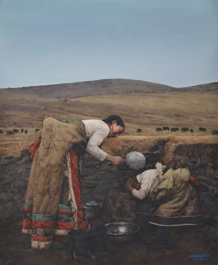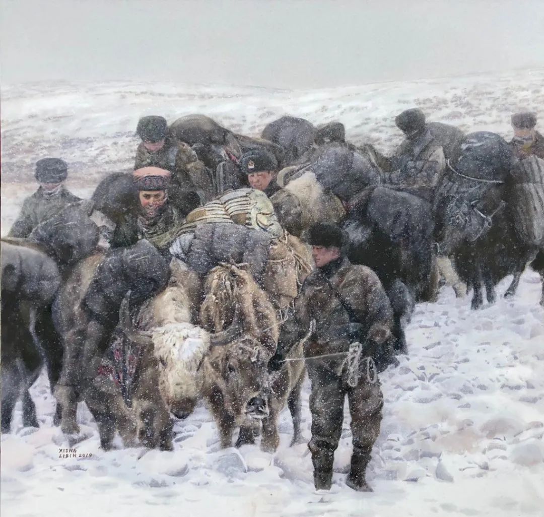 在第12屆全國美展中引人注目的《草原上的人們》,是熊禮斌運用圖像定格人物形象而重組畫面的有益嘗試,此后,他將畫面聚焦于雪域藏區,試圖以最寫實的方法精準再現高原民族的險惡生存環境與淳樸精神。他的畫面仍然具有圖像式的細微真實,但也融入了藝術造型對于形象的主觀理解與重塑,是現代寫實語言的一種探索。而造型藝術語言對于現實世界的審美重建,也是圖像不能完全替代的……