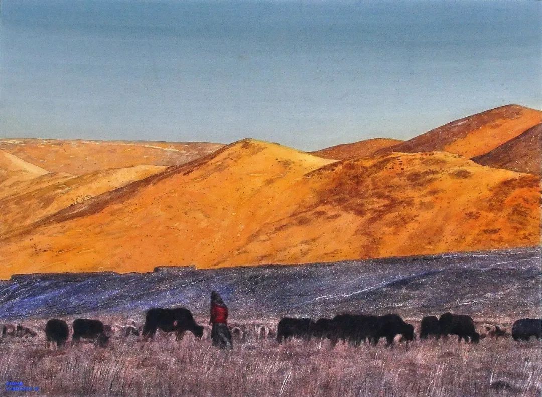 繪畫不單單是一種圖式,更應該是一種虔誠的信仰,它是訴諸于心靈和情感,是朝圣路上的自我修行。當今社會物欲橫流,精神匱乏,桑科草原系列作品呈現出的純凈與安寧,正如一股草原上的清風,給人洗禮與啟迪。創作過程中,我就象藏區牧民高原放牧那樣素樸,仿佛又回到桑科草原,重溫著人之為人的自由和快樂。這片雪域高原就是我靈魂的棲息地、心靈的原鄉。