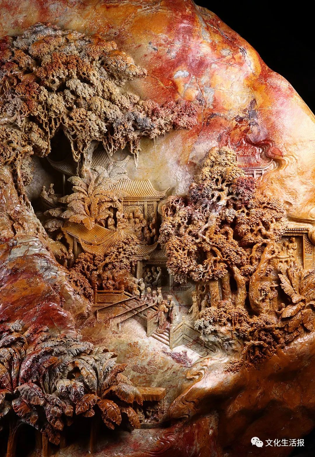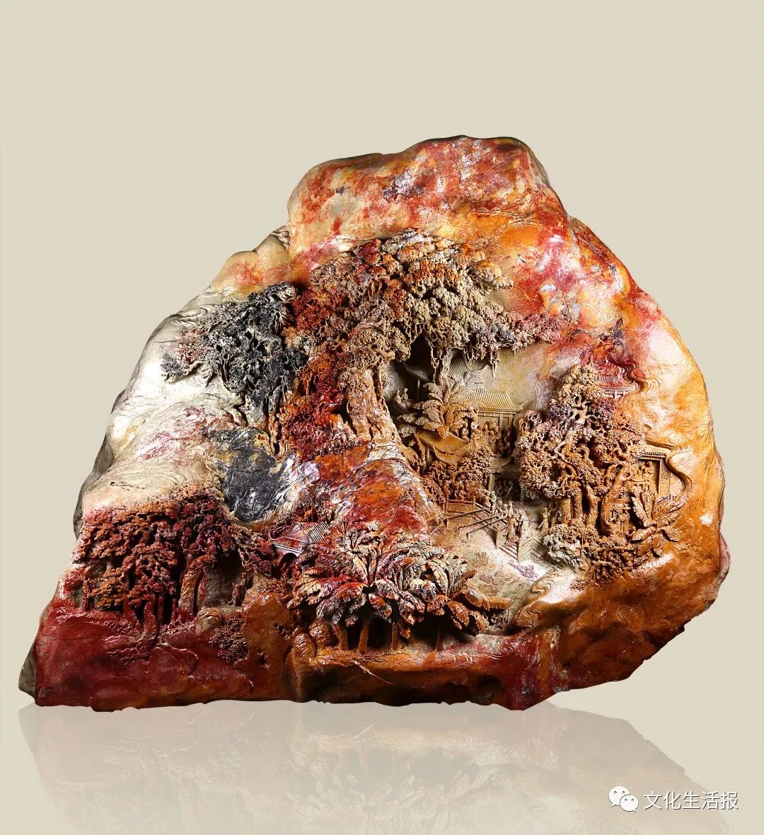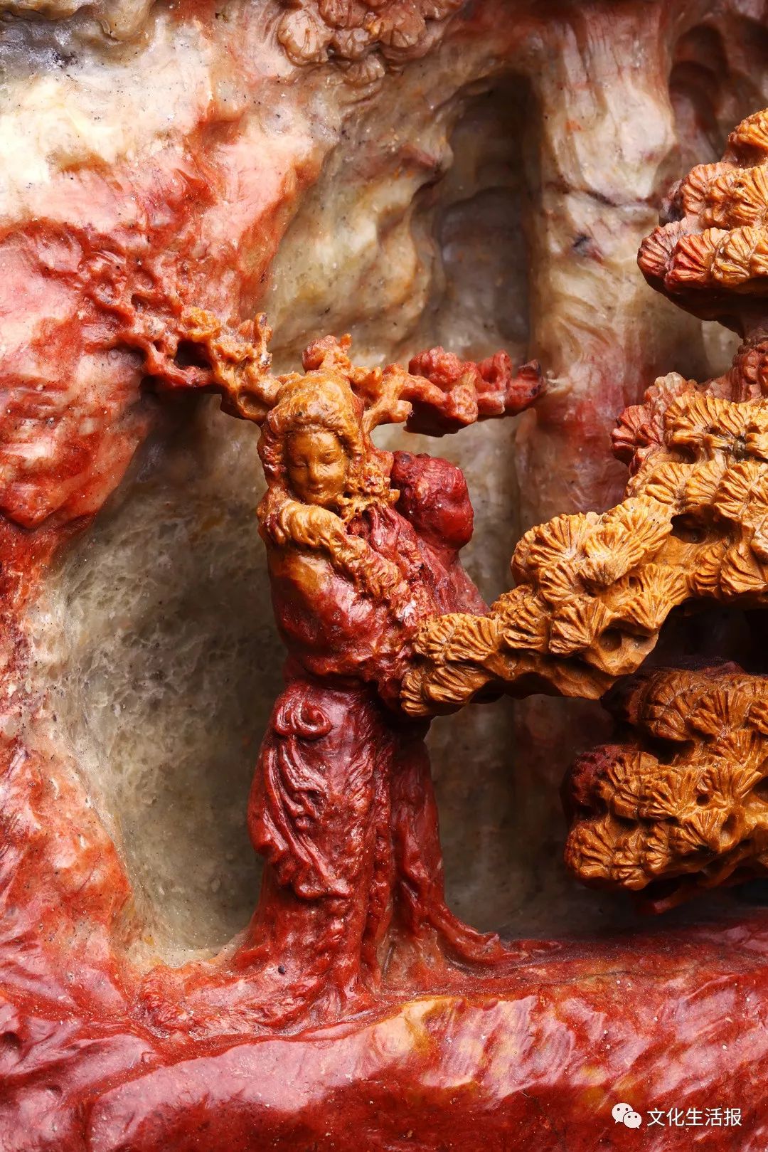 這件大作,是對壽山石雕刻藝術的一次拓展與創造,開拓了過去三百年來的具象與細作之路,雕出了宏偉氣象。此件作品前后耗時兩年有余,是林飛先生的心血之作,也是他對壽山石藝術長期思考探索的智慧呈現,作品很充分地展現出林飛先生高超的雕刻工藝水平,更展現出林飛先生在造型與結構上的塑造能力,展現出他的審美眼光和文化素養。“天一半,人一半”,這是他對壽山石藝術謙遜的獨特見解,而這件作品實是對他獨特見解的最好詮釋。