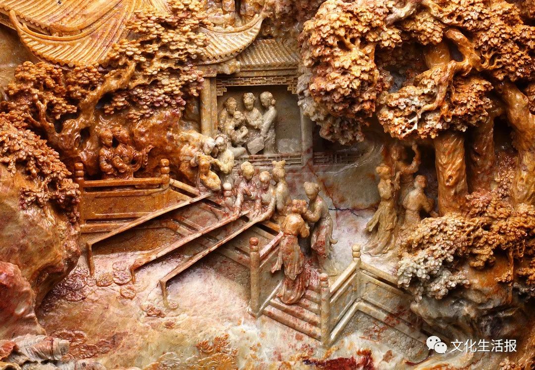 作品以數個大觀園里的紅樓夢故事來組成大觀園的時空藝術,本是文學與歷史的夢境,通過雕刻家藝術手段的再現,演變成了美不可言的妙境。這是一件有氣勢的大型壽山石雕刻作品,構圖大開大合,舒展開張,每一景、每一情,都令人心旌搖曳。局部地方體現出了各式傳統壽山石雕的純熟技巧,大整體上有畫意有塑造感。在雕功上,有高浮雕、圓塑、薄藝雕等,既有各種傳統刀法,更有西式的雕塑構造。作品豐富飽滿且整體感極強,體現出西方雕塑的歸整統一與氣度張力,極富視覺沖擊力,可謂壽山石雕刻與西式雕塑的和諧融合。雕與刻的空間張力飽漲,氣盈滿勢回蕩,充滿了渾厚沉實的力度。以繪畫來比喻的話,可以說有工筆的精細,有寫意的磅礴,更有意象的詩性,是當代壽山石藝術里一件難得的精品,難得的力作,代表了這一時期壽山石雕藝術的高度。善用材質的巧思,善于巧色的妙想,加上精益求精的“入石三分”的雕刻技法,融匯出渾然之美。意象與具象結合,在理性的思考上兼有感性的意境,讓人不知是天成還是人工,技法的嫻熟著實讓人嘆服,真是刀追清風心奪造化。