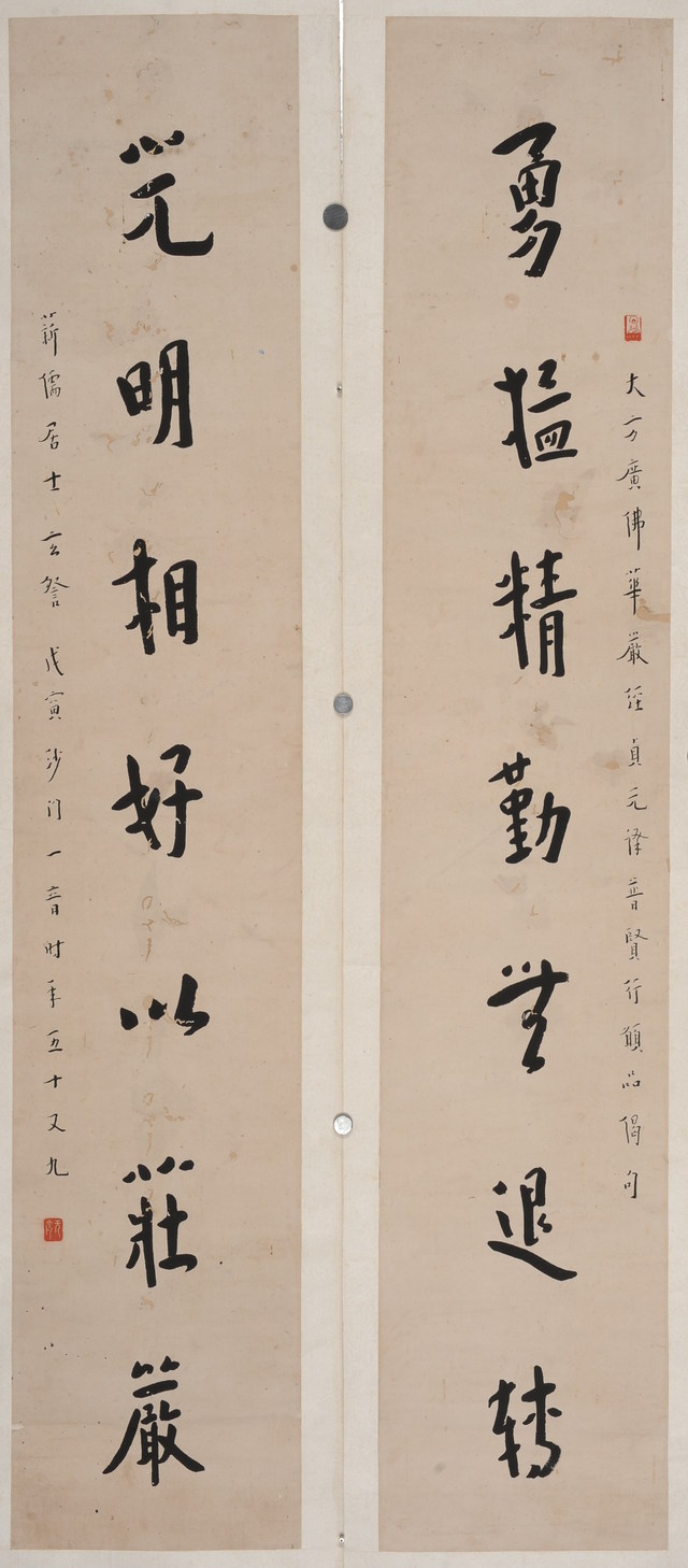 弘一法師的才子本性使他總要追求極致體驗(yàn),即使在后期的字,那常常被看作佛家的法書,細(xì)讀它,并非心如止水的“靜”。從他59歲(戊寅,1938年,福建師范大學(xué)藏)的手書《華嚴(yán)經(jīng)》偈句“勇猛光明”一聯(lián)來看,表面平樸,卻處處見匠心、藏玄機(jī)。其看似單純的筆觸充滿了不經(jīng)意的小起伏,14個(gè)字中有十幾個(gè)點(diǎn),無一雷同,三十幾個(gè)或長或短的橫畫,也沒有一筆重復(fù)?!懊途嗪谩保膫€(gè)豎畫雖同一方向欹側(cè),還有兩個(gè)“木”并列,依然讓人讀出同樣圓潤樸素之下的姿態(tài)多端。其用筆潛藏的曲折流轉(zhuǎn)通過撇、勾和連帶微微展露,把本應(yīng)顯現(xiàn)鋒芒的地方都化得柔和無比。聯(lián)句中“猛精勤明相好”六字左右結(jié)構(gòu)并列一處,左右兩部件配合處理卻是各各不同,“猛”上齊左低,“精”上齊右低,“勤”左高下齊,“明”上齊右低,“相”下齊右低,“好”則左略縮傾側(cè)而成險(xiǎn)絕,行楷聯(lián)中加了三個(gè)草字“無、轉(zhuǎn)、以”,妥貼自然毫無違和感,真是一個(gè)不動(dòng)聲色的結(jié)字高手。讀弘一法師成熟期的字,常常有一種如水漫過的感覺,至簡至樸中藏有千回萬轉(zhuǎn)的細(xì)微波瀾,行于當(dāng)行,回于當(dāng)回,貌似無所用心而規(guī)矩變化自在其中,其柔軟滋潤之下有不竭不止的力量在緩緩流淌,是水流般百折不回的不退轉(zhuǎn)之力,隨手點(diǎn)染,觸物成形,自在從容。