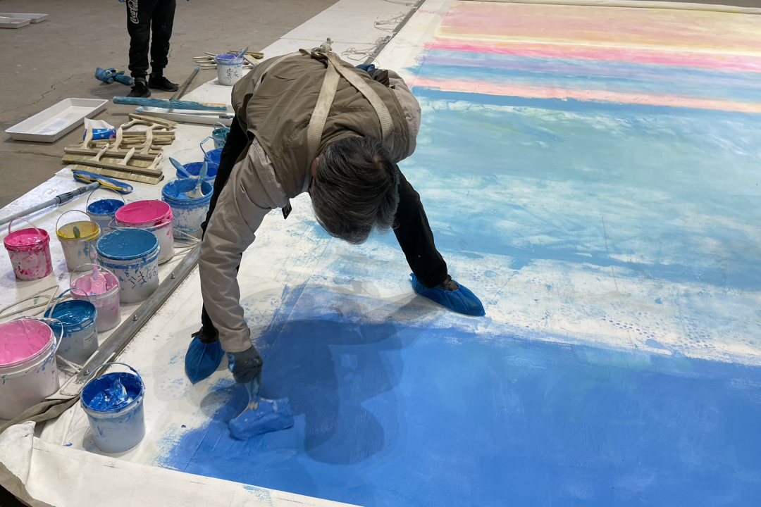 當時,我把在會客廳的這一幕拍下來傳給范迪安,看到這些不同角度的記錄,他也有些興奮,并發來幾張創作時的照片與我分享。要創作這樣一幅體量極大的作品,要花費之心血是可想而知的。畫布是定制的,創作也歷時4個多月。尤其這件作品屬于印象寫意風格,這樣的作品,觀者遠距離的欣賞,大氣磅礴。而創作者創作時卻貼近畫布,無論從作品通幅的結構還是色調運用都很需要功夫把控。