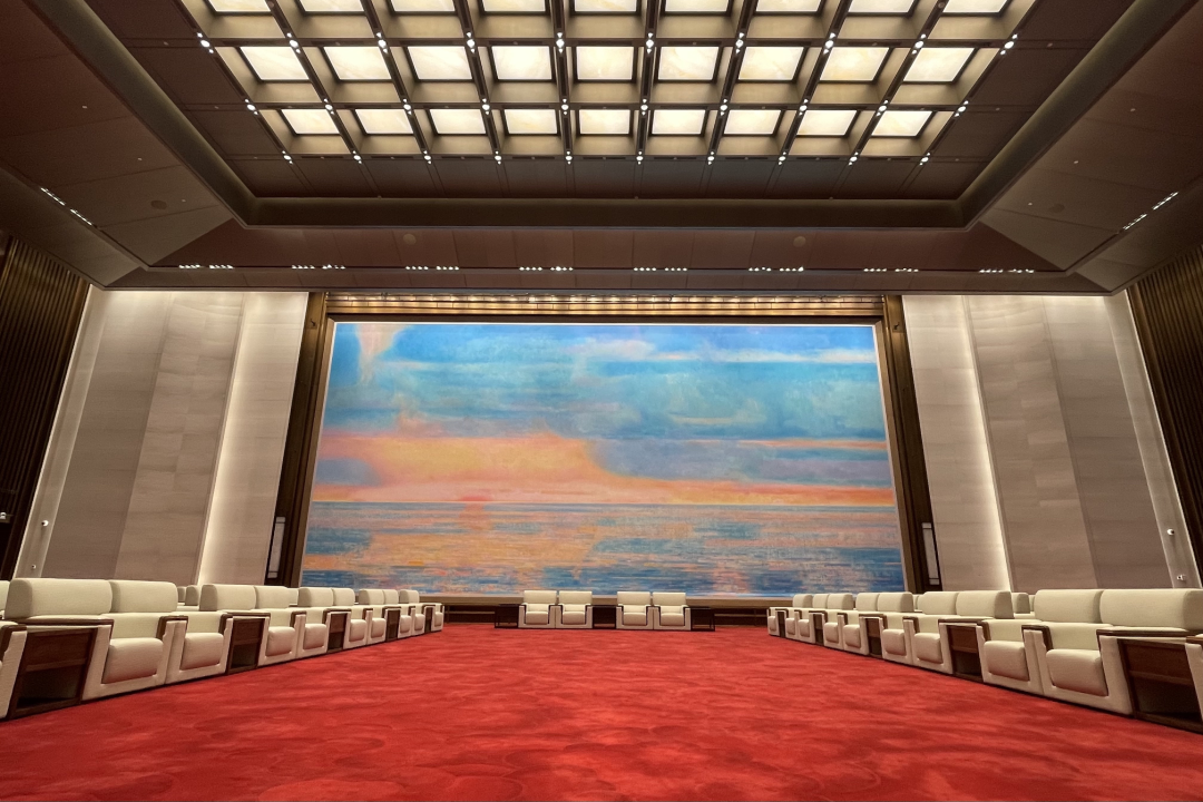 在世界會客廳一號樓的大會見廳中,有一幅超大型的油畫——日出東海,事實上這也是迄今為止中國最大幅的布面油畫。它的作者,是中國美協主席、中央美術學院的院長范迪安和中央美術學院教授劉商英。初次看到這幅畫作時,我大為震撼,一來,其尺幅巨大,會客廳的建筑又極為雄偉氣勢,二者結合,視覺上頗具沖擊力。二來,這件作品的色調迷人,以藍紫、粉橙的相交輝映描畫東海之上、晨光初露乍現的場景,明亮感之外,更有充滿期望的美感祈愿。