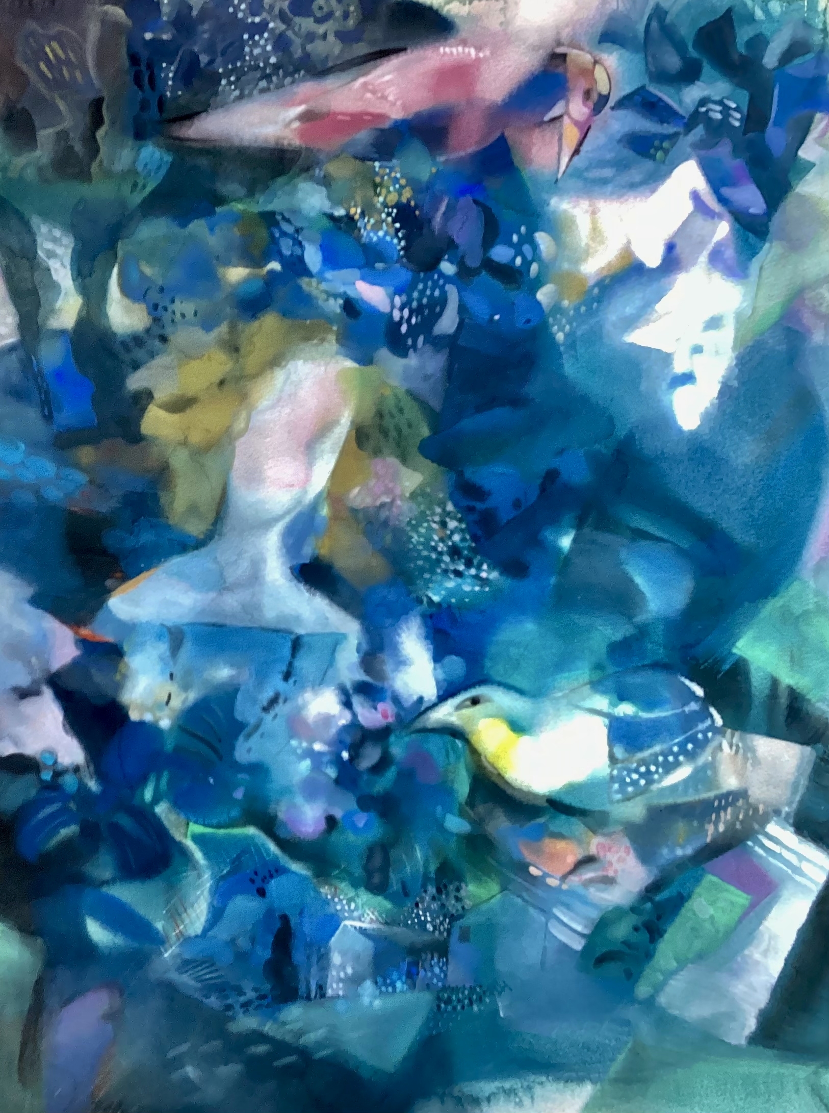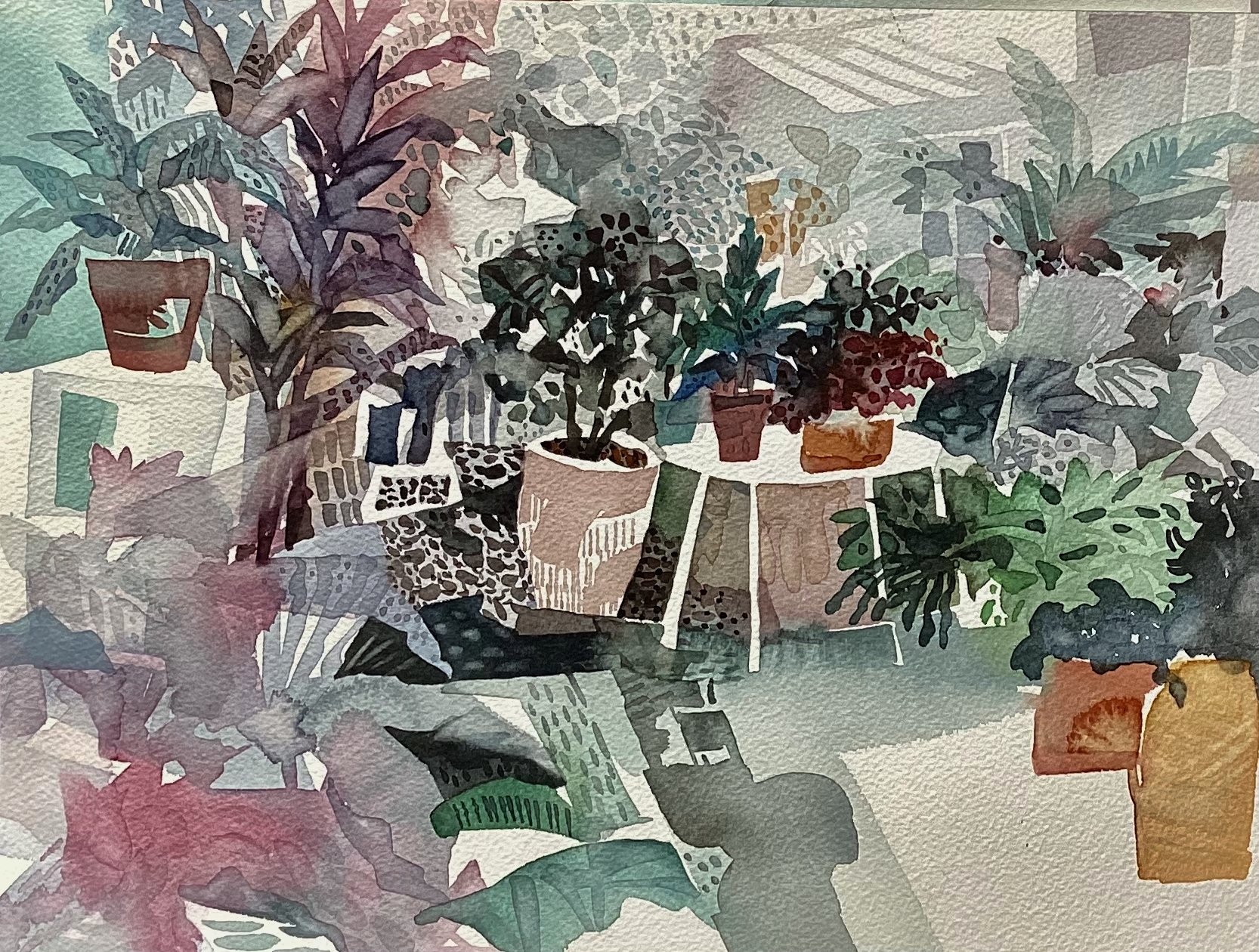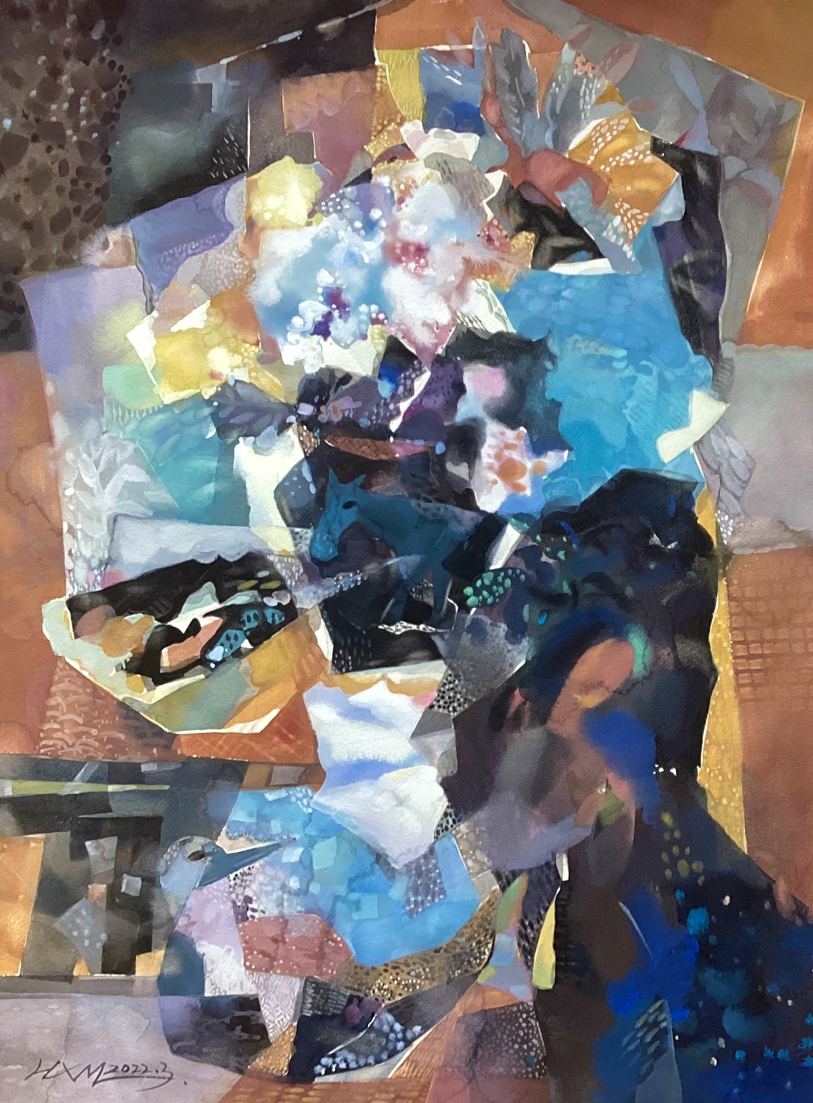 黃幸梅的水彩畫就很不一般,雖然她技法很好,但不是客觀的描寫,而是情感的抒發,想象的凝聚和主觀的表達。水彩畫本來是寫實的,水彩的技法總是通過對客觀對象的描寫展現出來。在黃幸梅的水彩畫中,用水較少的作品比較寫實,輪廓線非常清晰,形象也很準確。構圖很有特點,形象充斥整個畫面,有點像抽象藝術的滿幅構圖,不是為了再現對象,而是一種近距離的觀察,帶著期盼與觀念的觀察,表現的則是觀察的感受。如果再畫精細一些,就是超現實主義了。之所以強調這一點,就是要說明,黃幸梅的畫基本上是主觀與想象的,即使是靜物寫生,也有著超然對象的意味。濕畫是黃幸梅水彩畫的特點,用水不是玩水,水的把控與形象的把控是一致的。濕畫法本來是水彩的基礎,但黃幸梅這兒,濕畫卻有觀念的性質。在她的畫中,黑色的運用很有味道,她追求傳統水墨畫的情趣,黑色如同水墨的線條,用來概括形的輪廓和中和色彩的對比。但是,她的墨色又不同于水墨畫,由于濕底的作用,墨色塊沒有明確的輪廓,不是固定的形象,往往與周邊的顏色融合和滲透,產生一種霧里看花的效果。這似乎又是中國傳統繪畫的另一種意境。墨色與顏色在黃幸梅的畫中既是互補的,又是對應的。在力求明確的形象時,墨色起到構形的作用,而在要做意象表達時,墨色又提供了一個模糊的想象的空間。這一點與水墨畫是不同的,由于材料和技法的差異,濕畫法的水彩沒有清晰明確的輪廓線,色塊的邊緣總是向旁邊擴展,形成色與面的交錯。黃幸梅在作畫時,不是穿插干畫法來確定局部的輪廓,而是讓“水”放任自流,畫面上模糊一片,各色形等亦明亦暗,似有似無,本來是一個寫生的場面,卻像是一個想象的空間。實際上,她追求的就是這樣一個空間。她不是用水彩技巧來寫實再現,她是在有意無意地進入一個超現實的領域。墨色的運用就是有意為之,想用水墨與水彩交織,探索傳統藝術的意象。但另外三個要素又使她脫離刻意的規定,而進入一個自我的想象的世界。她的構圖是不標準的,沒有一個中心點,畫面上的東西好像是向四周擴散,目光隨意地游走,表面上是不經意地截取一個視覺的斷面,實際上是幻覺的使然。其次是線的收縮和面的擴張,這是在于她對水彩技巧的獨特理解。比如,像《惠安女》這樣的作品,雖然有一個確定的形象,卻沒有一個輪廓線,有點像水墨畫的沒骨畫法,一方面是用面的構成代替輪廓,另一方面是利用水彩的特性,將本來的線條融化為面。形象依然存在,但更多的是面的構成,有一種強烈的形式感。這種形式感既在于對象的啟發,也有她內心的意象,一種表現自我的需求。最后是色彩,看過她的畫的人,都贊嘆她色彩的鮮明與響亮,她似乎沒有顏色的顧忌,多么單純的顏色都能直接搬上畫面。她不擔心色彩的不協調,雖然不是刻意的安排,但每每在過于沖突的地方,她都會以自己的方式調解這種沖突。如《云煙》(2019),這幾乎是一幅抽象畫,補色的沖突造成色彩的強度,但穿插其間的黑色與白色不僅襯托了顏色的對比,還使得對比不那么刺眼。