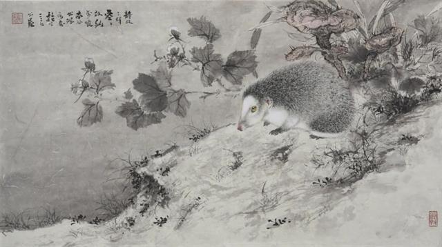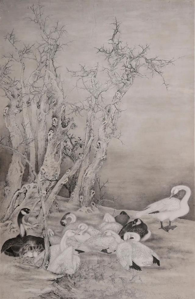 古人有畫有四難之說:筆少畫多,一難也;境顯意深,二難也;險不入怪,平不類弱,三難也;經(jīng)營慘淡,結(jié)構(gòu)自然,四難也。書鴻之畫格,一望而知,曰清韻拔俗,曰骨氣雅健。明凈而不膩,叢密而不雜。具體而論,他的畫成于造型謹嚴而不失生動,格局復雜而不亂疏密。平日多寫斗方小品,喜筆精墨妙,賦彩綺麗,又構(gòu)思巧妙,小中見大,于鳥獸顧盼花枝俯仰間自有一股靈韻漫溢,流露畫里畫外;定期而又經(jīng)營巨制,有氣象蕭疏、煙林清曠之致,氣、韻、思、景、筆、墨俱備,神采骨氣煥發(fā)其間,大有千林秋深,萬木雪寒之境。可見,無論何種尺幅題材,對筆墨潔凈潤澤,意境渾茫幽邃的追求,在書鴻近年創(chuàng)作中,一以貫之,已然彰顯。