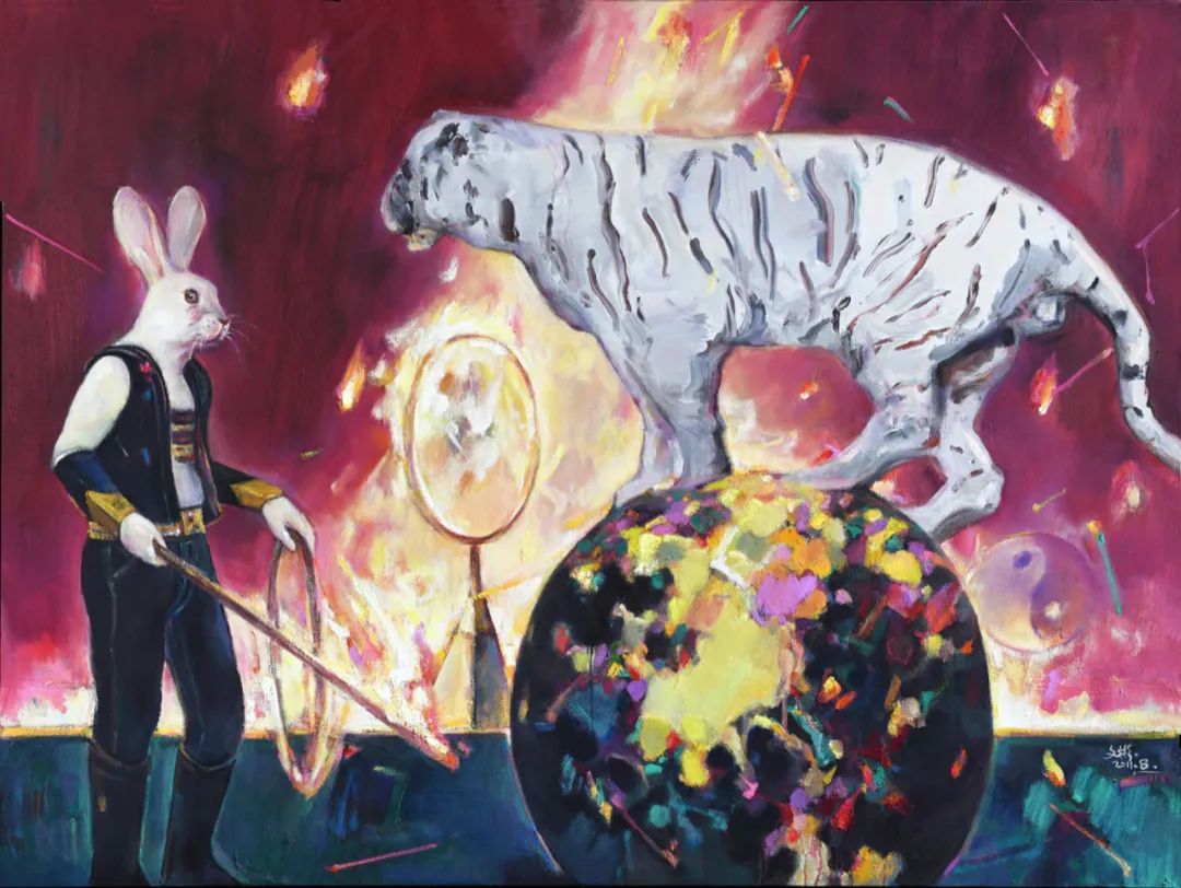 我是一個八十年代的大學生,那個年代的大學生都有一種理想主義的沖動,喜歡哲學,喜歡搖滾,八十年代有一種生機勃勃的開放精神。大學期間我看了很多哲學著作,叔本華《人生的智慧》、弗洛伊德《夢的解析》、尼采《悲劇的誕生》,對我都有著潛移默化的影響。九十年代對我影響最大的哲學家是羅素,他把知識關懷與社會關懷融為一體,羅素的人文精神啟發了我,我在創作《麥當勞叔叔》系列時寫過一篇《當代繪畫的知識分子命題》(發表于《江蘇畫刊》1997.1.),文章中有這么一段話:“對我而言,《麥當勞叔叔》系列重要的是用純粹的繪畫形象傳達人的精神感受和探討藝術切入社會的文化意義,是尋找繪畫在當代獨特的話語功能和建立知識分子獨立思考的工作狀態。”現在的我基本上還是在踐行著這樣的創作理念。生活中我是一個謙和的人,但內心又有一些很固執很堅守的東西。哲學家們更應該是尚智求真的知識分子,但被羅素稱為“社會良心”的知識分子在現實中常常是不合時宜的,需要有勇氣與膽識、良知與擔當。