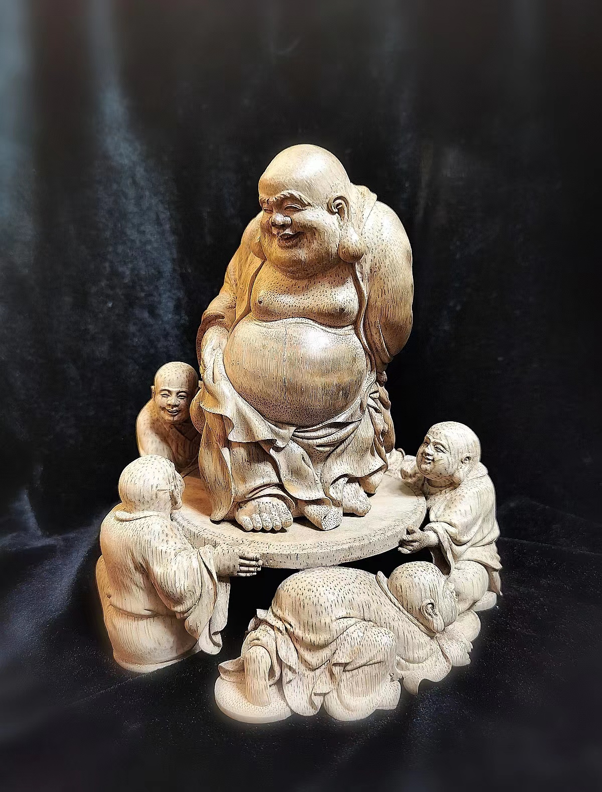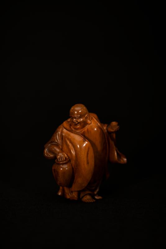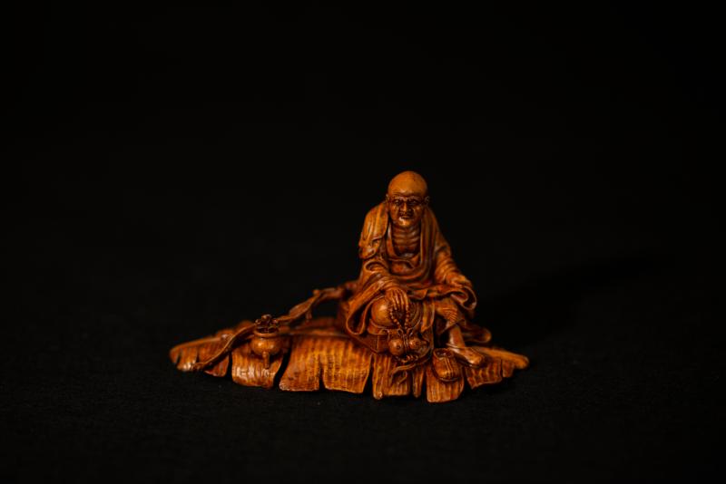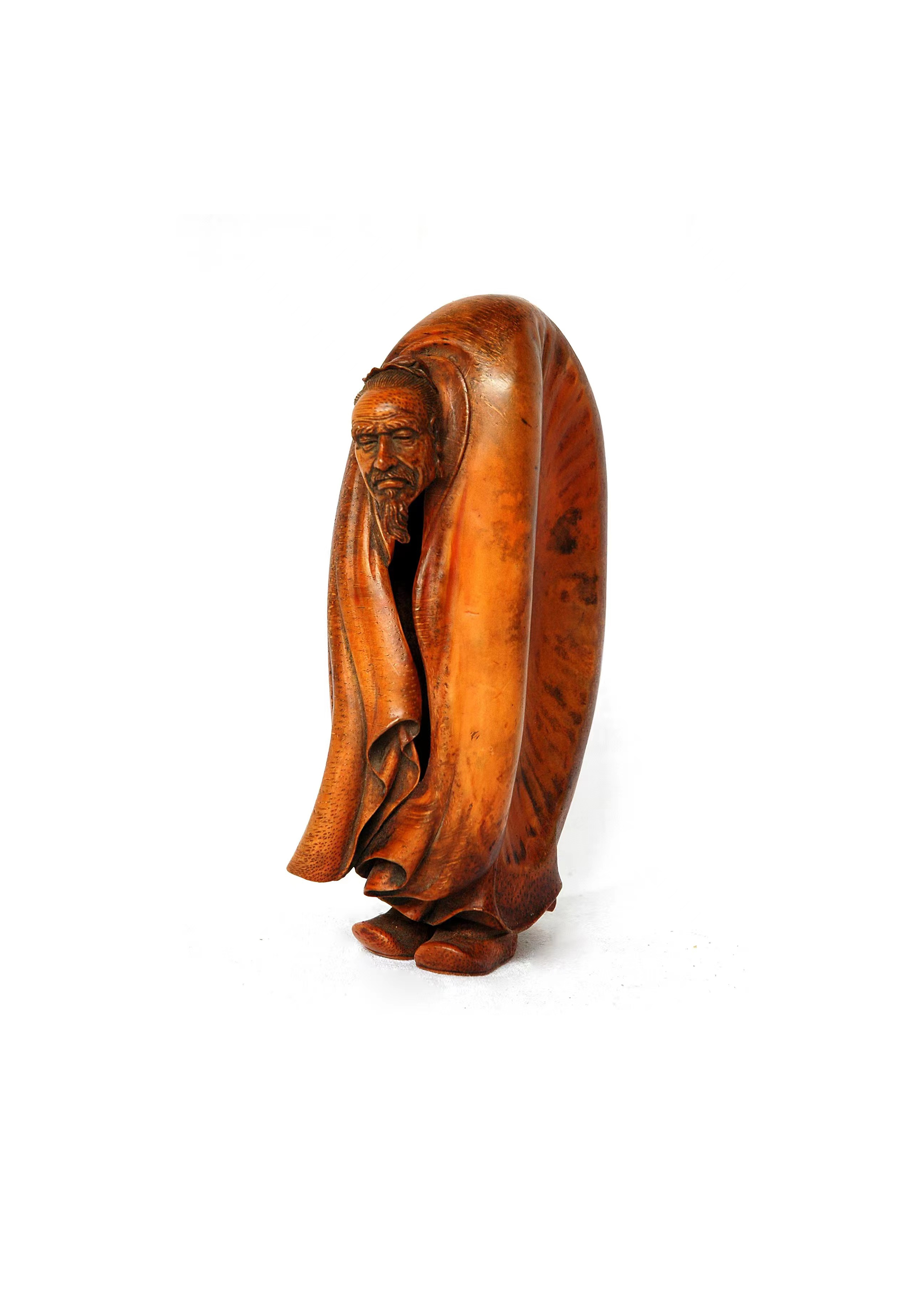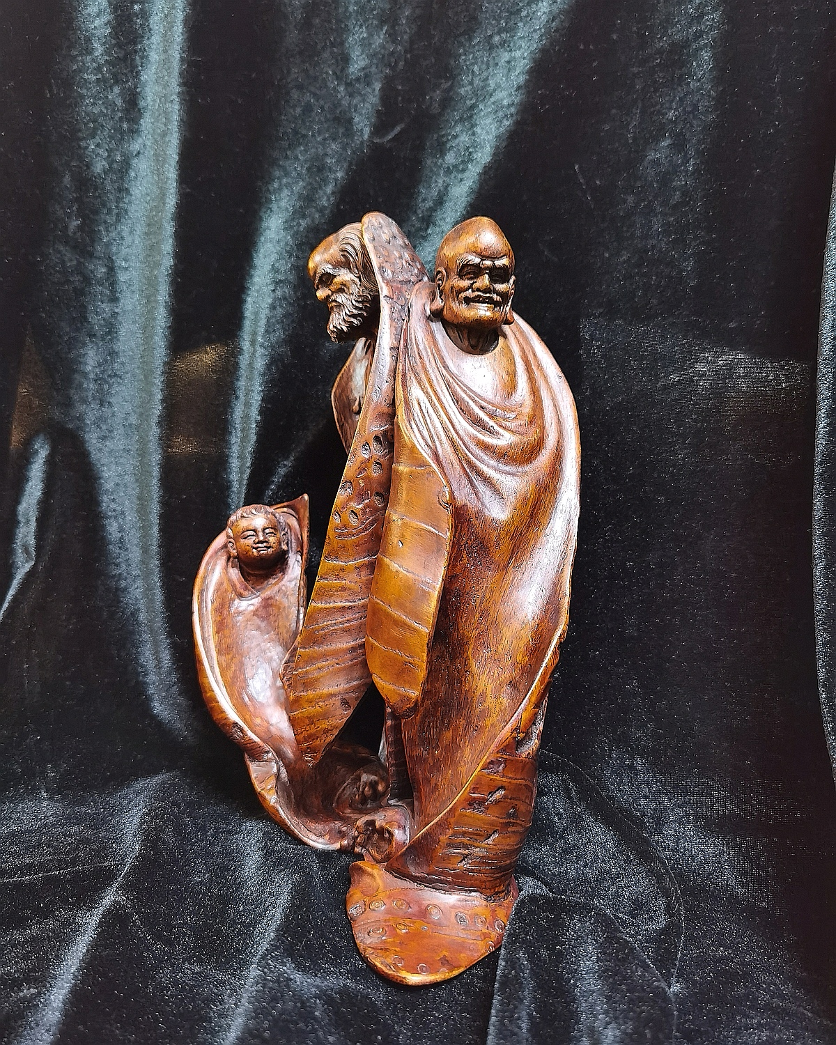 竹根旁生長出來的竹芽雕刻成觀音身邊的孩童,自然而有雅趣;竹子生長出來的不規則竹節便成了達摩身上衣服的褶皺,巧妙而不突兀……王新明巧妙地運用竹子自然奇特的造型,構思遐想,創造出一件件精巧的作品。