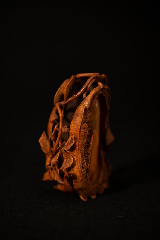 “根據竹根的自然狀態隨勢賦形,既要保留竹根本身原始的形態美,也要通過雕刻賦予它藝術之美。”每次下刀,王新明都要仔細斟酌,在竹青、竹肉和竹黃之間因材施藝。“一個是靠手感,一個是看竹纖維。如果竹纖維排列越松、竹肉越軟,就說明竹壁越薄,下刀要格外小心。”因為竹子容易崩裂、壁薄心空,力度難以拿捏,所有工序都只能由一人獨立承擔,一件優秀的竹雕作品至少要花數月功夫。
