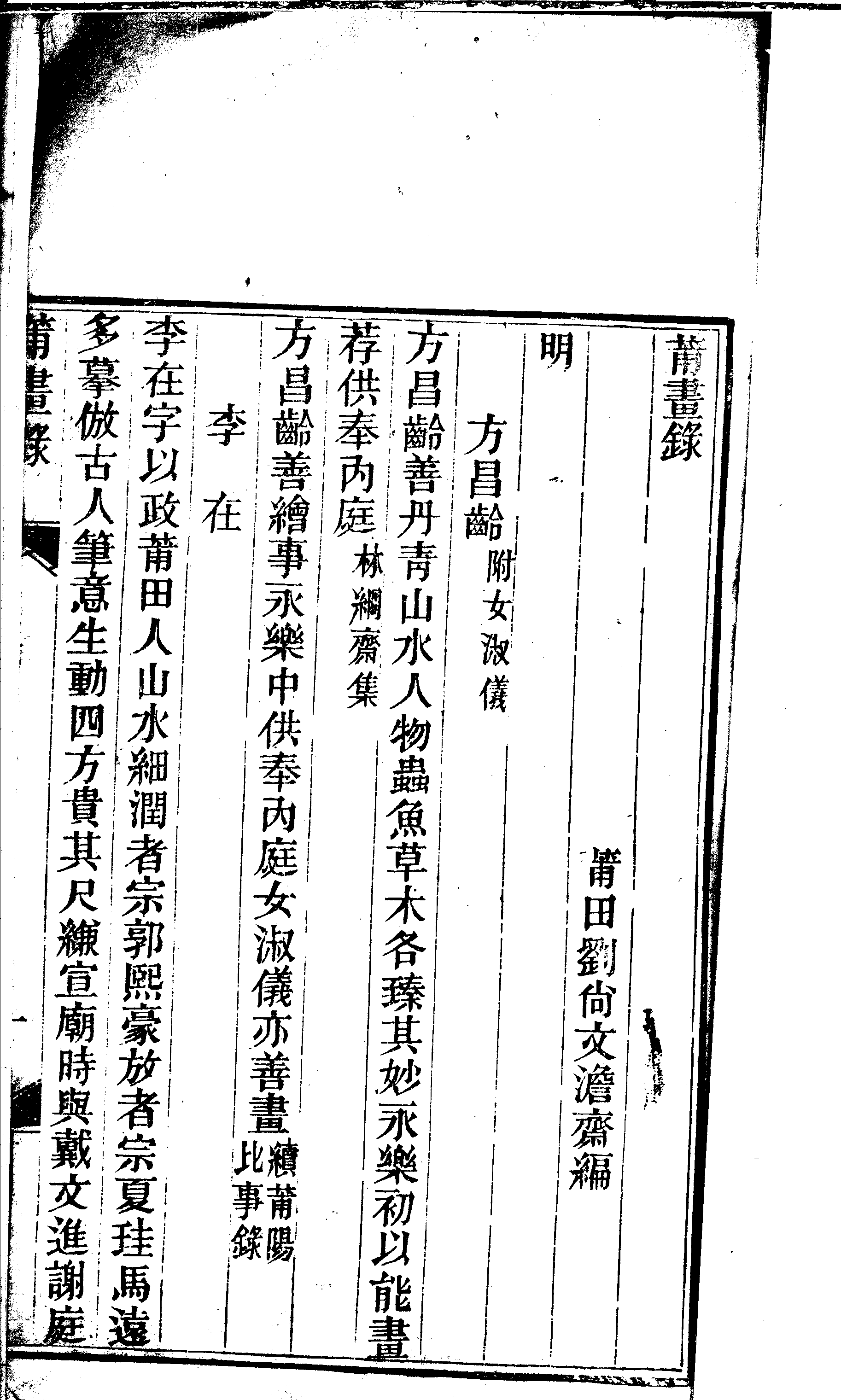 清末劉尚文(1845-1908)《莆畫錄》中“方昌齡附女淑儀”分別轉載《林絅齋集》:“方昌齡善丹青,山水、人物、蟲魚、草木各臻其妙。永樂初,以能畫薦供奉內庭 。”