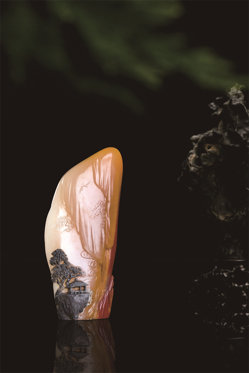 作品黑與白、黃與紅的巧妙利用和搭配, 石上的每一道線條都被賦予了絢爛的藝術生命,山間松云,一溪流水,小舟待渡,半山茅亭可供看山歇腳。中國畫的畫理與石融合,人間的萬象,也都濃縮于這石頭的盈尺之間。云靄浸過石梢,林風輕柔殘夢,孤松咬著石身。泊舟渡頭。一空一滿,石與靈感的不期而遇,神魂與山水的二合為一。整件作品沒有人的出現,但能讓觀者感受到“空山不見人, 但聞人語響”的意境。