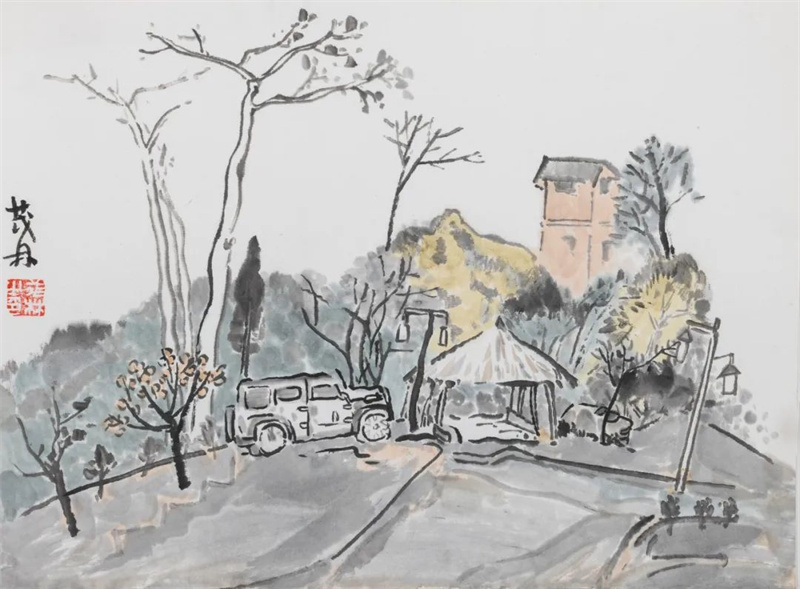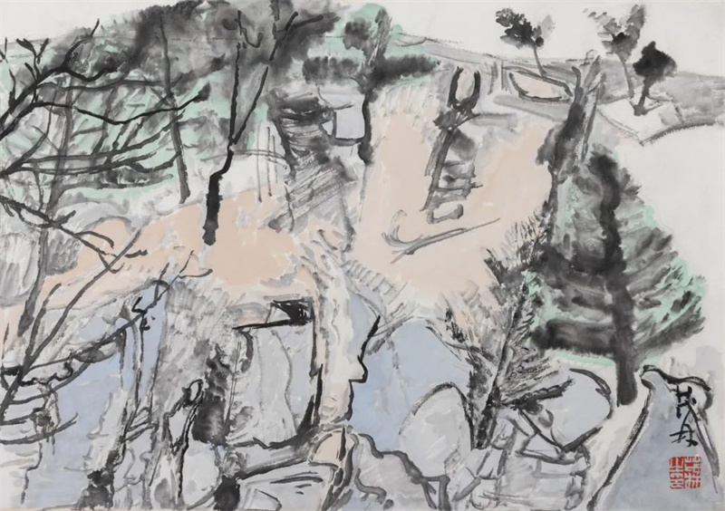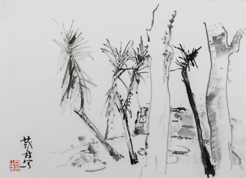這些繪畫特質在他的水墨寫生中表現的自由而又恣肆,他的畫面在無序的表現中形成了主觀的空間生成,書寫性的線條多變而不加修飾,這種感覺是具有玩味性的,不是程式化的制作,書寫性的線條和筆質力道的表達都很硬朗,質樸而有意趣。里面有一種“生”的東西,不是熟練,是生澀、鮮活,與流俗的手法格格不入,也不是學院派里面模式化培養出來的套路的程式畫法,他的這種感覺很個性又有耐讀性和藝術性。