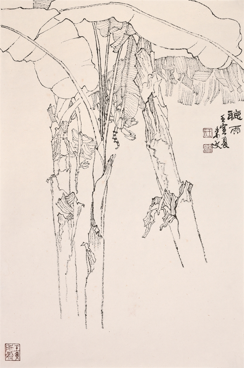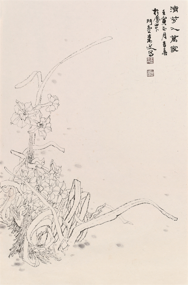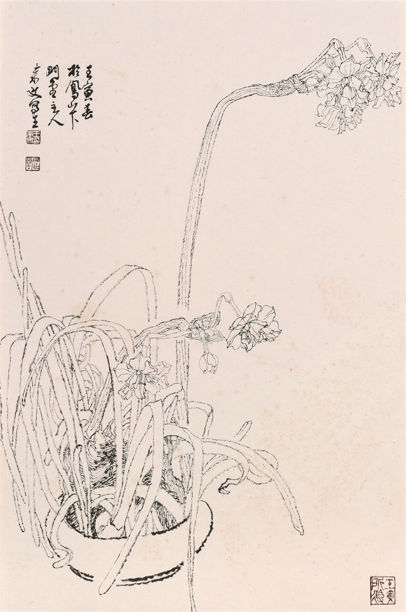 王來文是在本土成長起來的畫家,其白描藝術根植于閩派傳統。福建自古以來,就有白描寫意的傳統,如南宋筆下的飛天云龍,鄭思賢的線描簡筆幽蘭;明代更是名家輩出,邊景昭、李在、上官伯達、曾鯨、吳彬等人皆能工能寫,其中吳彬以白描羅漢著稱,被稱為“夙世詞客,前身畫師”;而自清以降,出現了兩位在美術教育史上有著深遠影響的白描高手和兩部堪稱經典的白描范本。其一是清初的上官周及其《晚笑堂竹莊畫傳》,其二是現代的陳子奮及其《陳子奮白描花卉冊》。上官周晚年創作的《晚笑堂竹莊畫傳》,集歷代名家之大成,用白描的手法生動地刻畫了秦漢至明初120位歷史人物,該畫集自乾隆八年(1743)刊行以來,至民國200多年間,多達10余種版本傳世,成為“近一二百年來學習人物畫的重要范本”(葉淺予語)。陳子奮以金石書法入白描花卉,俞劍華評其白描“是含有顧愷之、李龍眠而獨成一格,成其所謂陳子奮的白描”。晚年創作的《陳子奮白描花卉冊》于1959年在上海美術出版社出版印行,至今仍是許多藝術院校國畫專業的指定范本。王來文1987年考入福建師大美術系主修中國人物畫,當時正是85新潮高漲時期,王來文卻沒有隨波逐流,從資料室借來《晚笑堂竹莊畫傳》、《陳子奮白描花卉冊》等范本,書不離手,反復研習,認真揣摩,繼而上溯唐宋諸家,又潛心研究陳老蓮、任伯年的線描造型,深得傳統白描藝術之精髓。