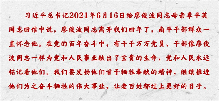 廖俊波是在南平市成長起來的時代楷模。他的初心啟程于南平的綠水青山,守望在廣袤的閩北山川,傳揚于無垠的華夏大地。