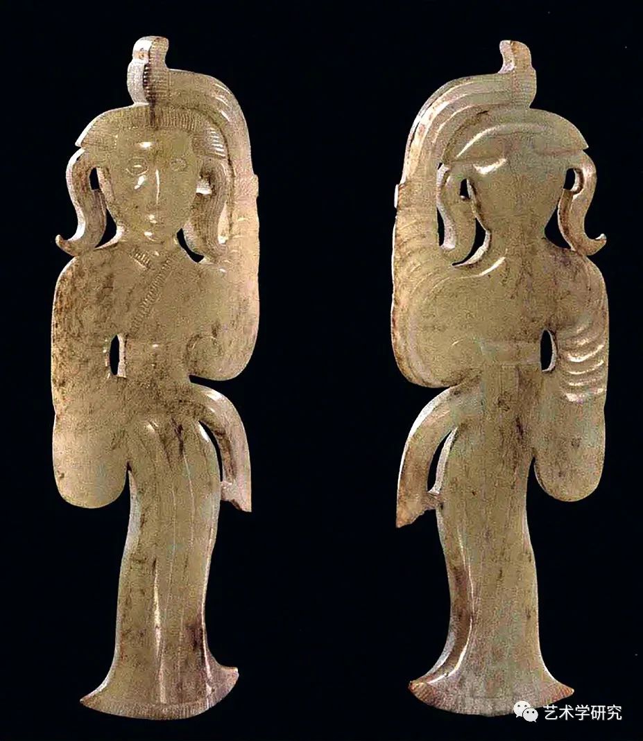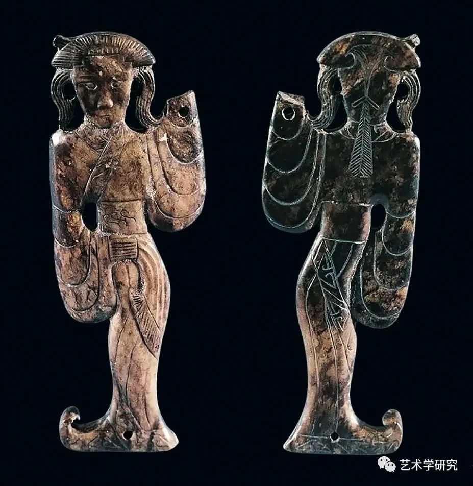 較之戰國玉舞人而言,漢代玉舞人的藝術水平較低,工藝較為粗糙,造型上乏善可陳,只能說稍具其形,細節無從辨識,更毫無美感可言。同為片狀的玉人雕刻,有一些戰國時期制作的作品雖然體積很小,但并不影響其制作上的精雕細琢。如1976年在河北平山中山國3號、6號墓出土的幾件玉人,大小只有2.5至4厘米左右,仍能看出其工藝的精美——玉人橄欖型的眼睛、突出的鼻子、牛角狀的發髻,以及腰間的大帶、網格狀裙擺的紋飾等清晰可辨;而漢代玉舞人在同等單位面積的玉片上刻劃的線條比戰國玉舞人大幅減少。根據漢代玉舞人所呈現的制作特征,可將之概括為兩種發展趨勢:一種是制作趨于簡勁化,以西漢前期的玉舞人為代表,作品用線疏朗,造型簡潔洗練;另一種是制作趨于拙劣化,以東漢時期的玉舞人為代表,線條魯鈍生硬,造型粗糙。
