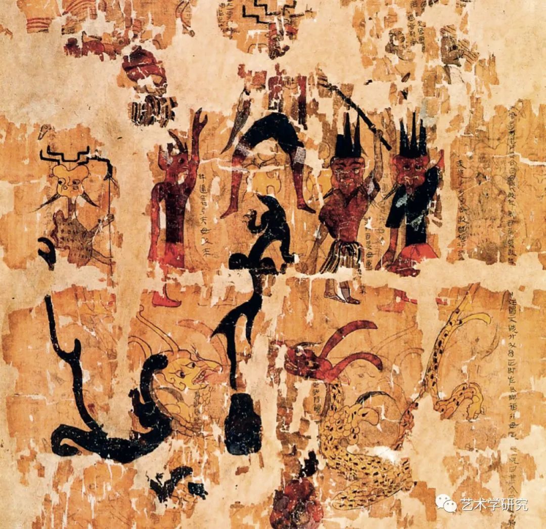 最后,在舞姿上,主要包括身體和手兩部分。舞姬的下肢微曲,形成婀娜的身姿,鞋頭向一側起翹,增加了曼妙的色彩。舞姬一手甩袖上揚——這是戰國玉舞人最重要的一個特征,另一手平置腹前,水袖自然下垂,這種向相反方向舒展的手勢在當時可能有特殊意義,劉建認為它或與通天達地的禮儀有關。此說可信,馬王堆三號漢墓出土的一件被命名為《太一祝圖》的帛畫作品可為佐證(圖10)。該作品雖已殘破,但經過專家的仔細拼合,還是能夠大致看出圖像的內容:畫面的上方有5位神人正在進行諸如祛儺逐疫之類的儀式,其中3人的姿勢可以明確判定為一手(執物)上揚,一手下垂,體現出手勢與儀式之間的關聯性。