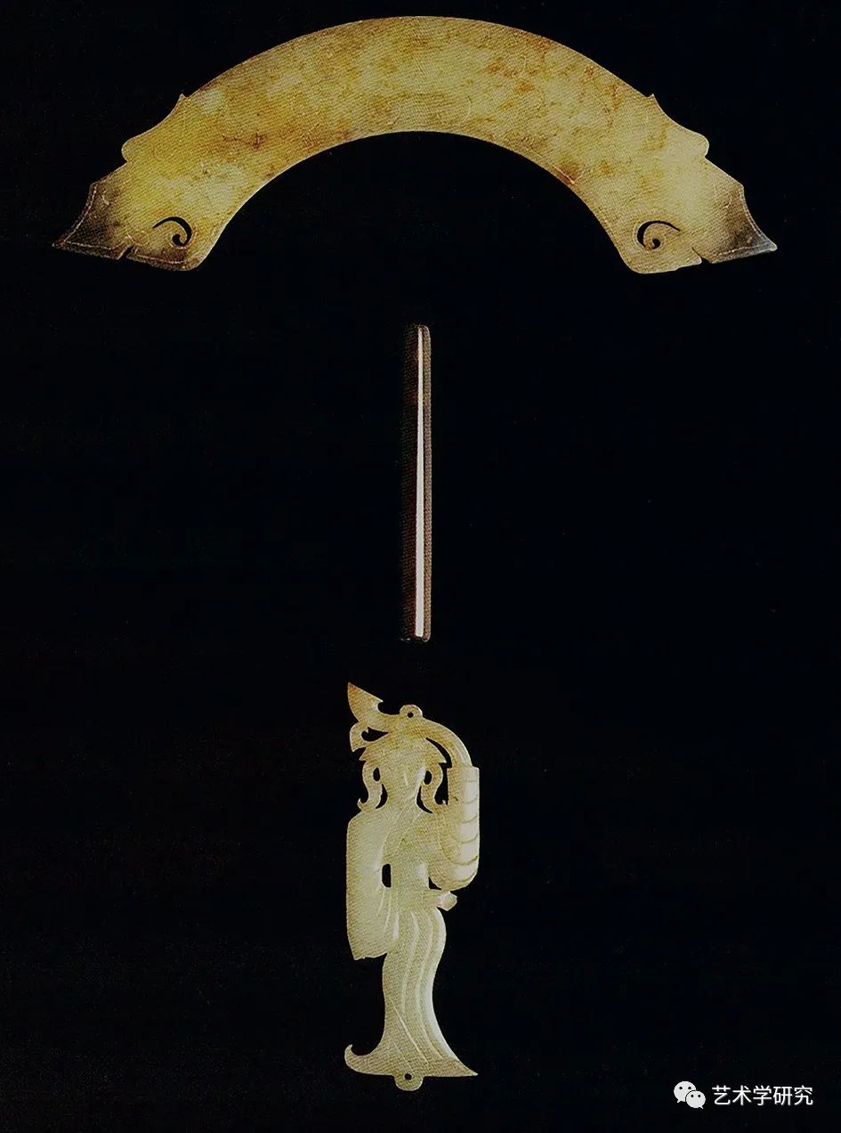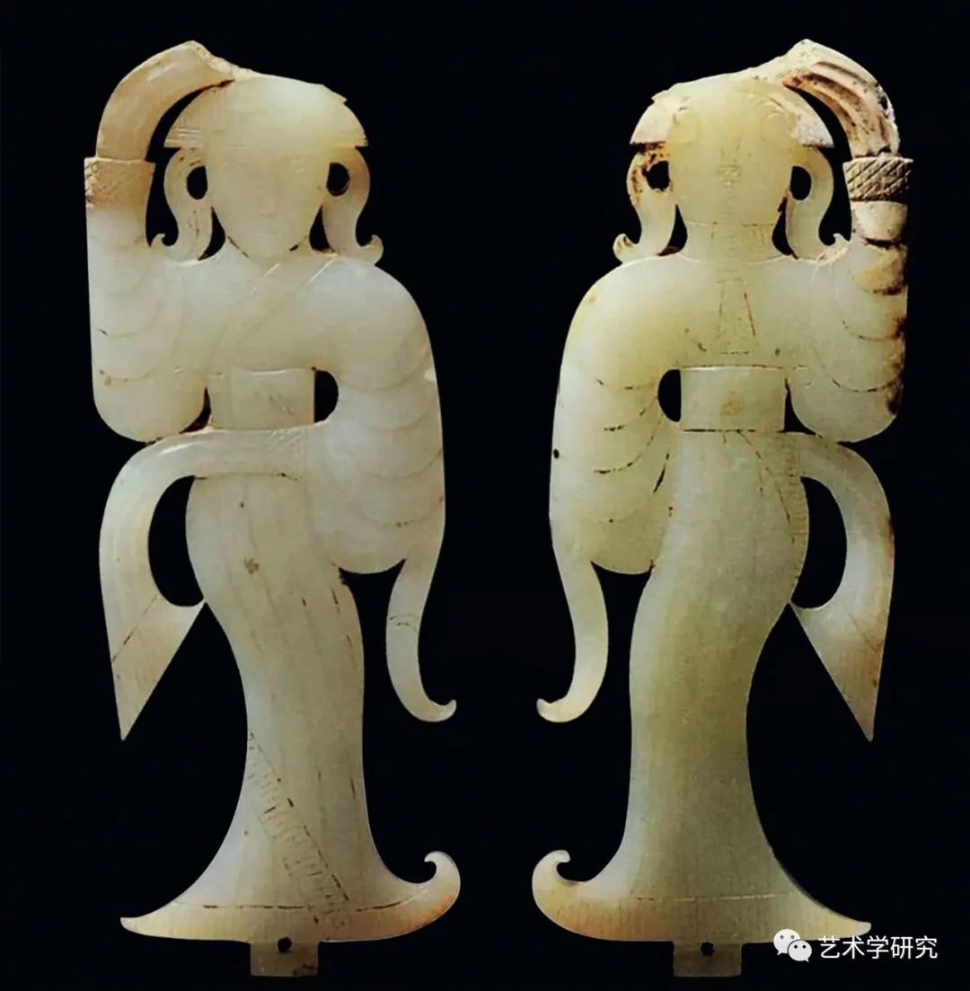 后期的玉舞人沒再有這種玉璧或與之相關的環境,但是其所代表的意義卻因符號化的動作而被固定下來,這種具有特殊意義的符號在某種程度上被視為祥瑞,在秦漢時期與社會普遍盛行的升仙觀念相結合。如出土于漢宣帝杜陵的圓雕雙聯玉舞人,從形制上看,它與通常所見的漢代玉舞人區別較大:首先它是圓雕,而漢代的玉舞人基本上都是薄片狀的;其次,這件聯體玉舞人體量巨大;最后,跟它一起出土的還有一件玉杯。同樣的玉杯,目前僅發現于廣州南越王墓中,其出土時置于銅制承露盤之中,《史記·武帝紀》載,柏梁臺上置承露盤,以“承云表之清露”,以“和玉屑飲之”。由是可知,杜陵出土的這件玉杯很可能也具有類似的功能,蘊含著升仙觀念。