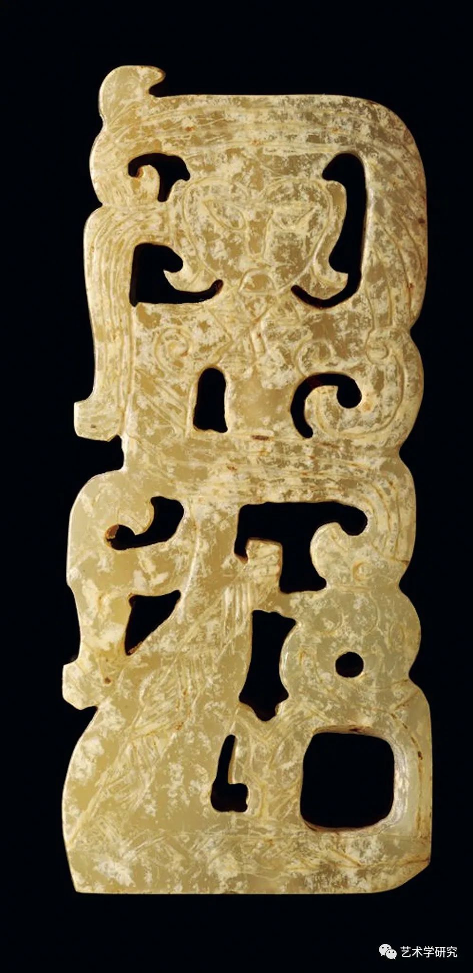 雙聯玉舞人是組玉佩中的一件,除玉舞人之外,該組玉佩還包括玉管、連體雙龍佩、卷體龍形佩,以黃金鏈穿綴而成。雙聯玉舞人長7.5厘米,白玉材質,片狀,鏤雕,以精細的陰刻線描五官和衣紋,除了一些蝕坑和蝕斑,整體品相較為完好。另有一件A.W.巴爾(A. W. Bahr)舊藏的玉舞人(圖4),據說也出自金村大墓。作品高8.3厘米,除右手袖子的后半截(可能連帶其附近的發飾)殘斷外,在細節設計與制作上與雙聯玉舞人的左側舞姬造型幾乎完全一致。