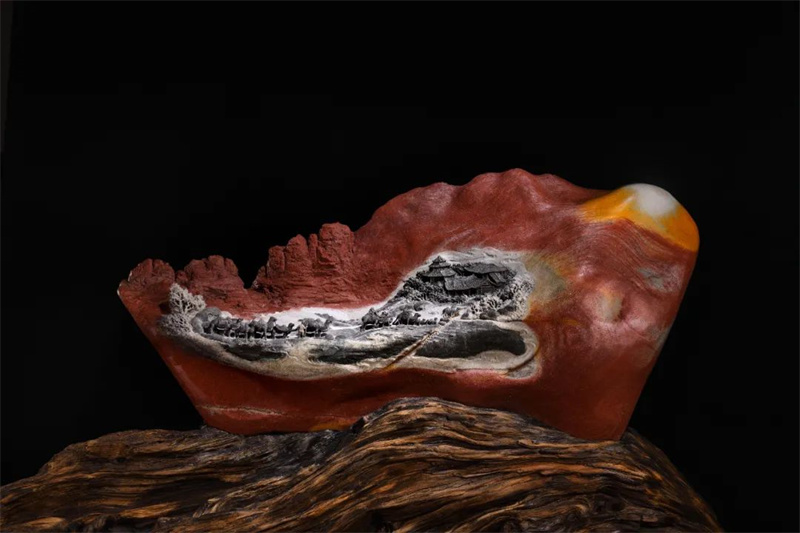 藝術風格與創新:在保留原石風貌的基礎上,采取航拍遠眺廣角鏡,以全景式敘事方式,結合傳統國畫技法,行刀正側轉折,意蘊并合,道樸古拙,達到“外師造化,內得心源”的境界。通過因材施藝,以色取巧,以具象鏤雕技巧,使自然與人文景觀相映成趣。
