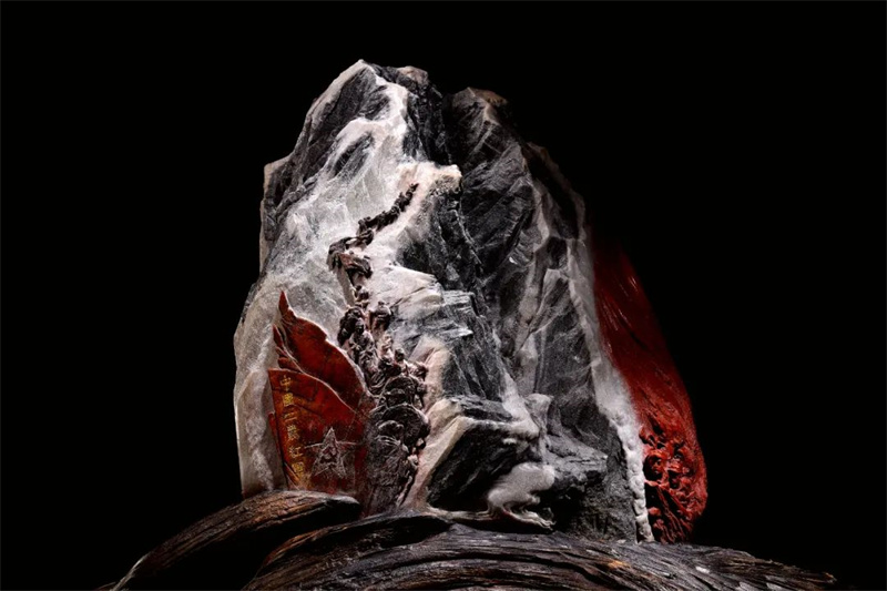 “紅色鐵流”比喻中國戰斗力極強的革命隊伍代表長征精神的“紅色鐵流”猶如精神的火炬照亮歷史、當代和未來。“紅色鐵流”的雕刻作品正是以刀為筆歌頌長征史歌。該原石黑色面積最大,最外層由紅、灰、紫色薄層巧色組成,中間裹著白色。石材外層紅、紫巧色由底部往上延伸,呼應中間形似白雪的白色塊。根據該原石的巧色及石材形狀,設計一幅紅軍翻越雪山的畫面。石材左側底部的紅、紫巧色設計成紅軍軍旗及紅軍隊伍。紅軍隊伍在終年積雪的雪山由下逶迤而上,這正是一支無堅不摧的“紅色鐵流”隊伍。整件作品從三維的角度看,使觀賞者感受到來自“紅色鐵流”強烈的視覺沖擊。根據畫面的整體和石材塊面色彩的分布,采用圓雕、鏤雕、浮雕及雕塑相的技法融合,同時將右邊的大片紅色巧色大膽的運用花崗巖雕塑的立體大塊面創新技法。