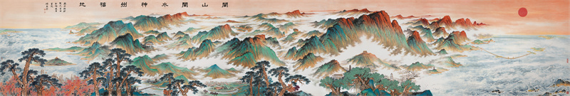 《閩山閩水神州福地》是東平老師2023年新創作的巨幅青綠山水畫,長達8.5米。此畫以工筆重彩的青綠來全景式地展示秀美多姿的福建山水,以概括精練的手法、絢麗明艷的設色和工細精當的筆致濃縮浩瀚千里于一卷,布置宏遠,氣勢開闊又細膩精到。畫中青山、白云、蒼松、綠水、碧海相互牽引,深具張力,營造出山嶺逶迤、煙嵐升騰、大海蒼茫的壯美景象,仿佛祝允明的形容:“物物有一種生意,造化之妙,勃如蕩如,不可形容也。”在右上角噴薄的紅日照耀下,高山之巔的深紅色、天空的淺絳色和群山腳下的金色又進一步豐富了畫面的色彩表現力和視覺沖擊力,增添了富麗與輝煌之感。畫家精巧地采用遠距離俯視、散點透視的視覺構圖,讓觀者既感到群山巍峨,油然而生高山仰止之情,又有登高望遠,一覽眾山小之感。畫中沒有一個人,但顯現的是福建人民創造的新時代幸福美好生活,還特別提煉了福建省九地市和平潭綜合實驗區標識性的自然和人文景象,突出了福建特色的福文化理念,是一幅富有新時代新氣象的瑰麗畫卷。
