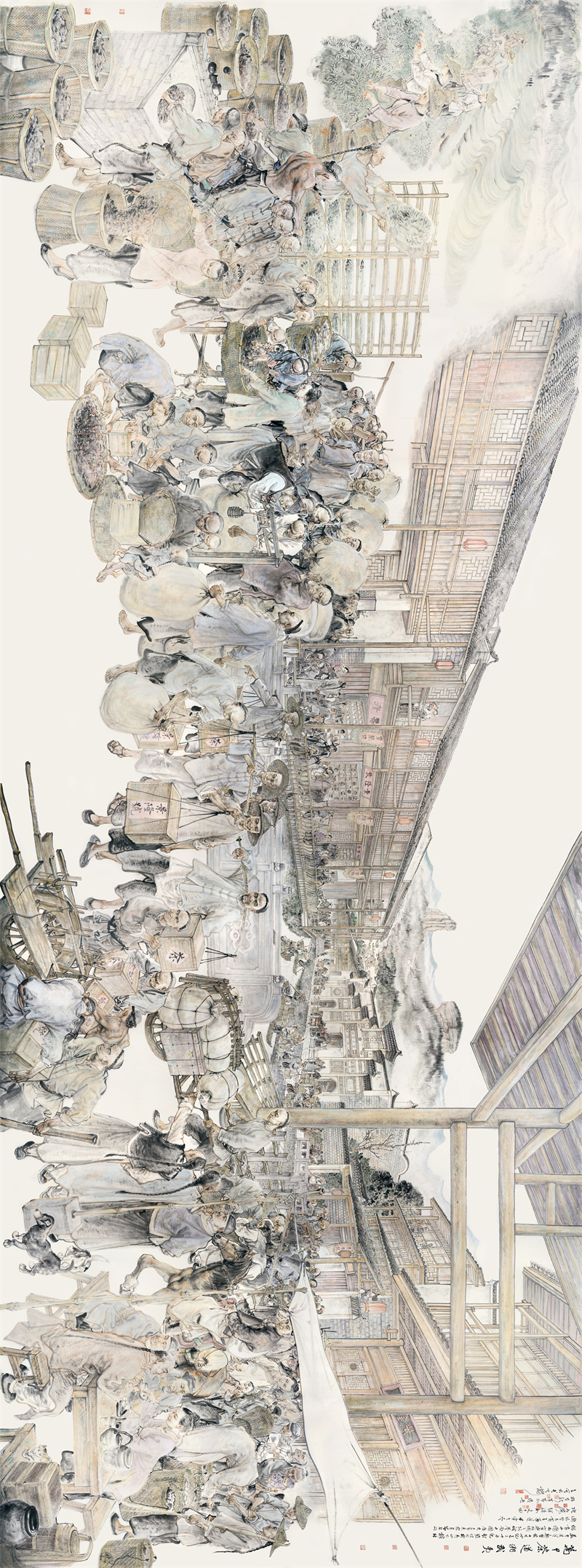 歷史的瞬間終于駐留在這里,飽滿充實(shí)又透徹流動(dòng)。畫(huà)面之間人頭攢動(dòng),木樓聯(lián)排,溪流清澈,牌樓高聳,第一陣強(qiáng)烈的視覺(jué)沖擊之后,人們很快會(huì)察覺(jué)畫(huà)面隱含的敘事:從采青、曬青、搖青、炒青等諸多制茶工藝流程到包裝、販賣、肩挑背馱、碼頭與竹筏構(gòu)成的水系運(yùn)輸,彎曲的溪流遙遙指向了崇山峻嶺之外的另一個(gè)世界。畫(huà)家采用古典山水畫(huà)的散點(diǎn)透視,不同時(shí)空的景象并置于同一個(gè)畫(huà)面。并置不是僵化的羅列,畫(huà)面隱含自上而下、自左而右、自山而水的內(nèi)在回旋,回旋銜接溪水的流向形成向北而去的開(kāi)放構(gòu)圖。所謂的敘事暗示出前后相隨的情節(jié),這是意義重大的啟程——后繼的故事延續(xù)了13000公里。人們認(rèn)得出,這個(gè)畫(huà)面是武夷下梅村的歷史情景再現(xiàn)。對(duì)于畫(huà)家說(shuō)來(lái),一個(gè)山坳之間的小村莊形成了強(qiáng)烈的震撼。