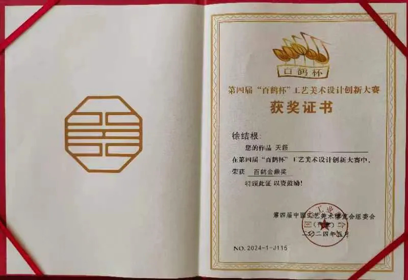 2024年5月12日,正高級工藝美術師、廣東省工藝美術大師徐結根先生榮獲第四屆中國工藝美術博覽會“百鶴金鼎獎”與“傳統工藝大國非遺工匠”榮譽稱號。
