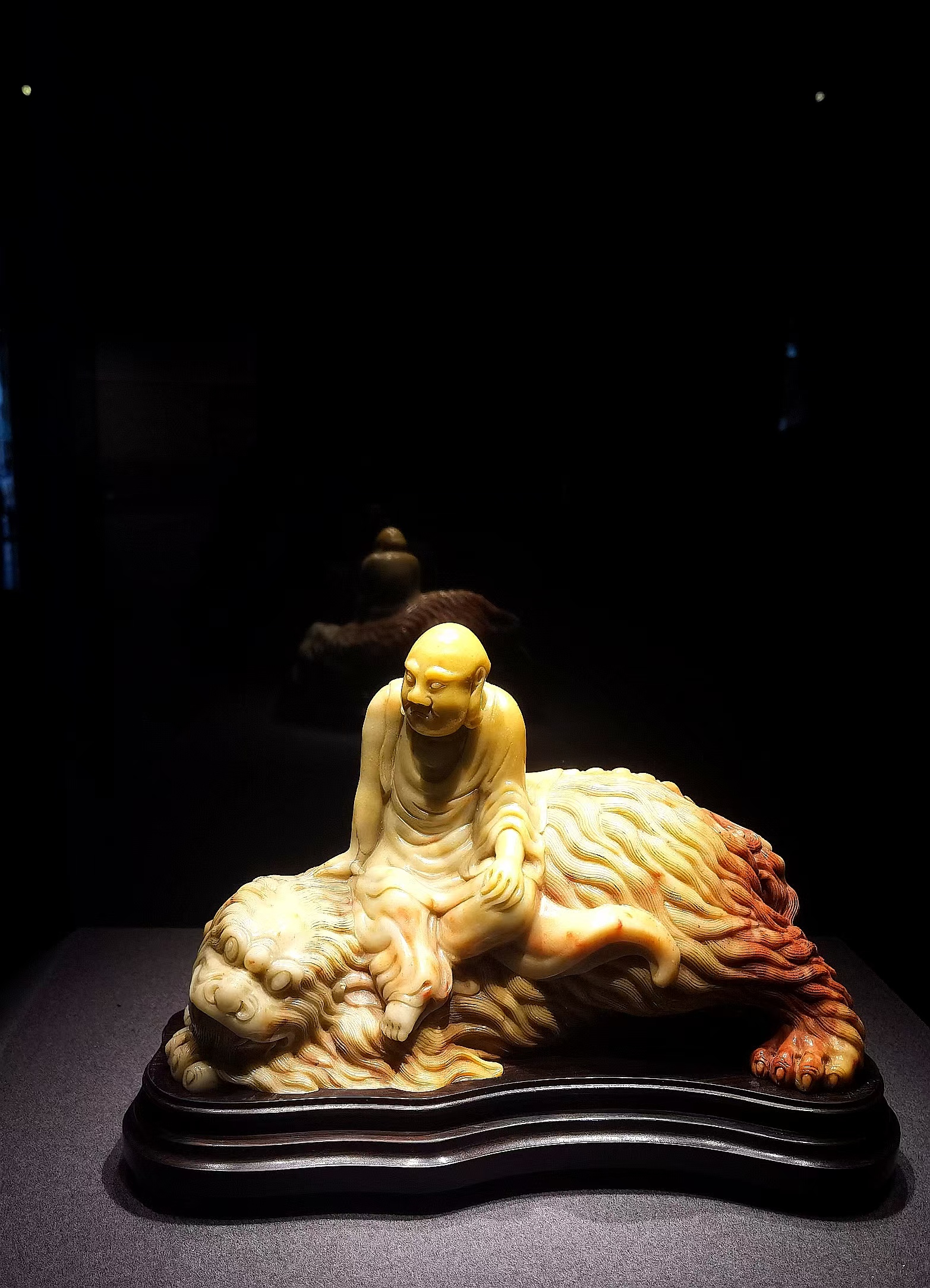 “壽山石雕刻里,當塑造的主體不是動物的時候,則它們的形象大部分完成的是裝飾效果,有些則被用來作“俏色雕刻”,也就是創造一個視覺的焦點,刺激大家的感觀。小型甚至微型的壽山石雕刻體量有限,獸的元素就經常是工具化的。鈕雕更是如此,獸刻的大,人刻的就小,總而言之,重心只有一個。但是在我看到這套羅漢圖式的時候,我感到一種獸和人共同構建畫面的可能。這很有意思,在石濤的筆下,獸不是陪襯,它有時候和人是平等的,也能成為場景的核心組成部分。這種新奇感,也是促使我從原本的領域突破,開始創作人物圓雕,以及繪畫式、場景式作品的最初原因。”