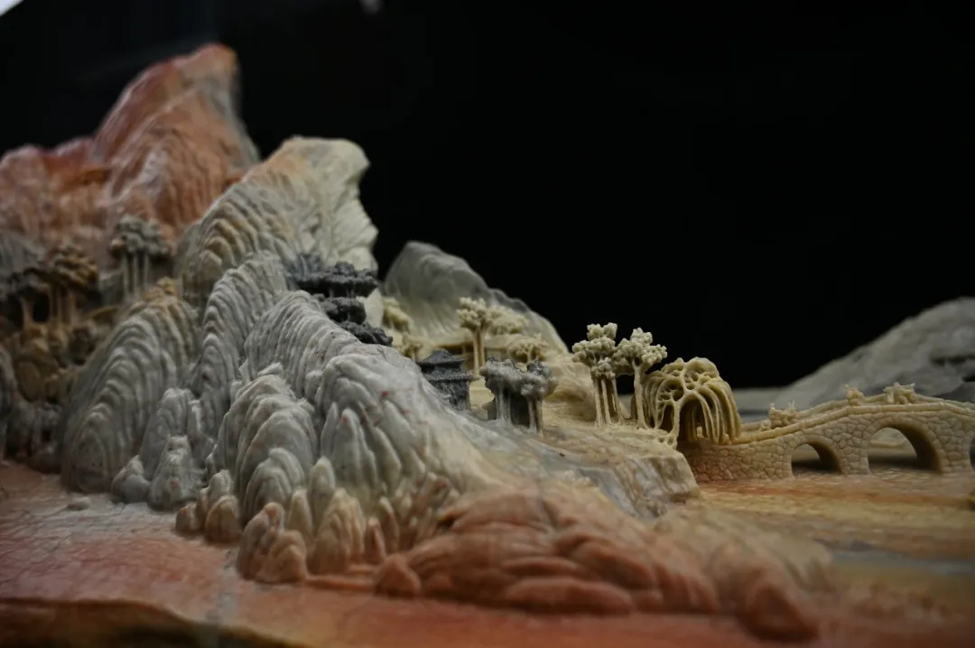 文人畫,又稱士大夫畫,追求的是一種超脫世俗的清雅之氣,文人畫的美內斂、含蓄、淡泊而又充滿文化內涵。壽山石雕以其色彩的豐富多樣和質地的溫潤如玉而著稱,陳禮忠巧妙地將心中的山水意境移植于石雕之上,賦予作品獨特的藝術魅力。