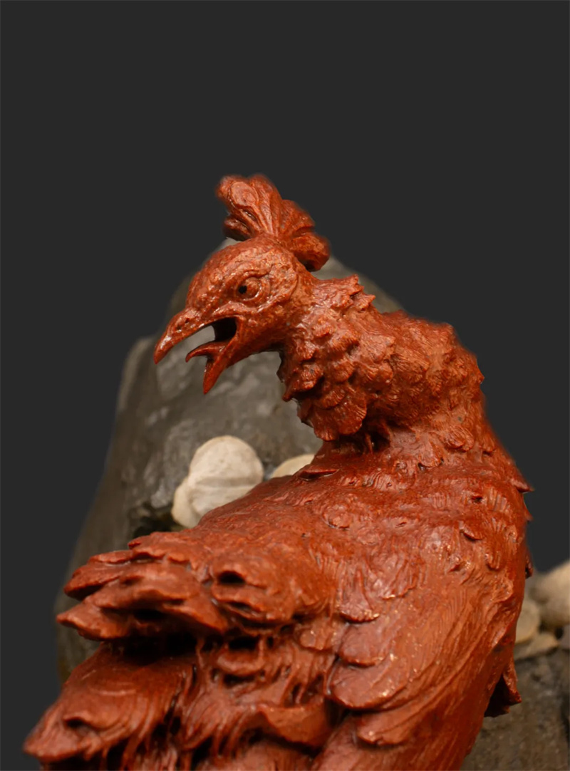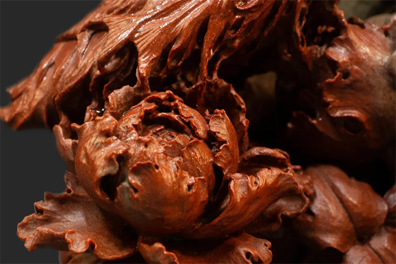 陳禮忠作品《牡丹孔雀圖》根據原石天然色彩因色取巧、因材施藝,紅色部分刻畫了一對孔雀和盛開的牡丹,灰黑色部分刻畫湖石,湖石形狀奇特,表現出自然界的勃勃生機。