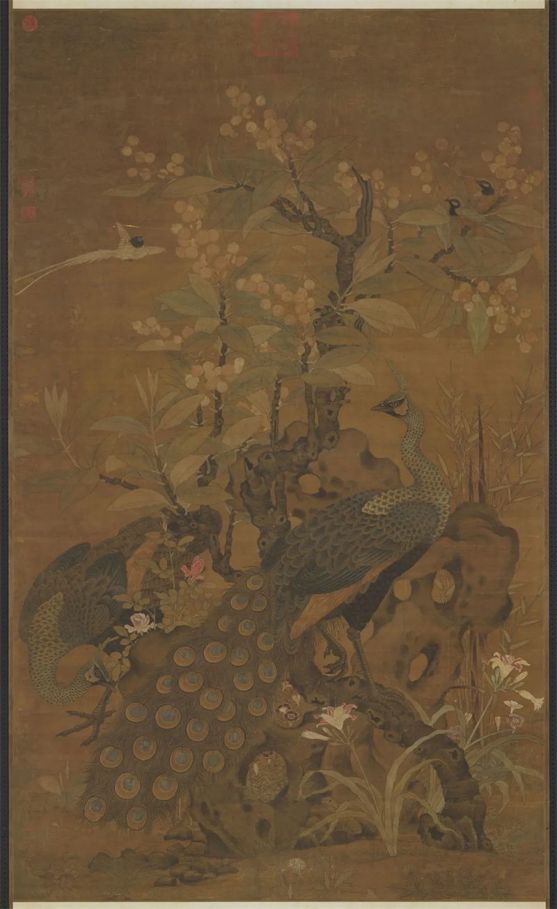 雄者棲于山石上,回首顧盼,尾翎徐徐展開。雌者在旁,抬頭仰望。其毛羽斑斕,與花匯成一片絢爛春光。作品難能之處在于布局繁密而不亂;富麗而不俗。
