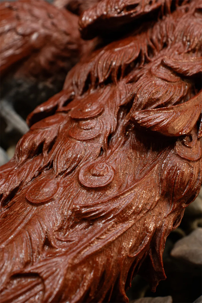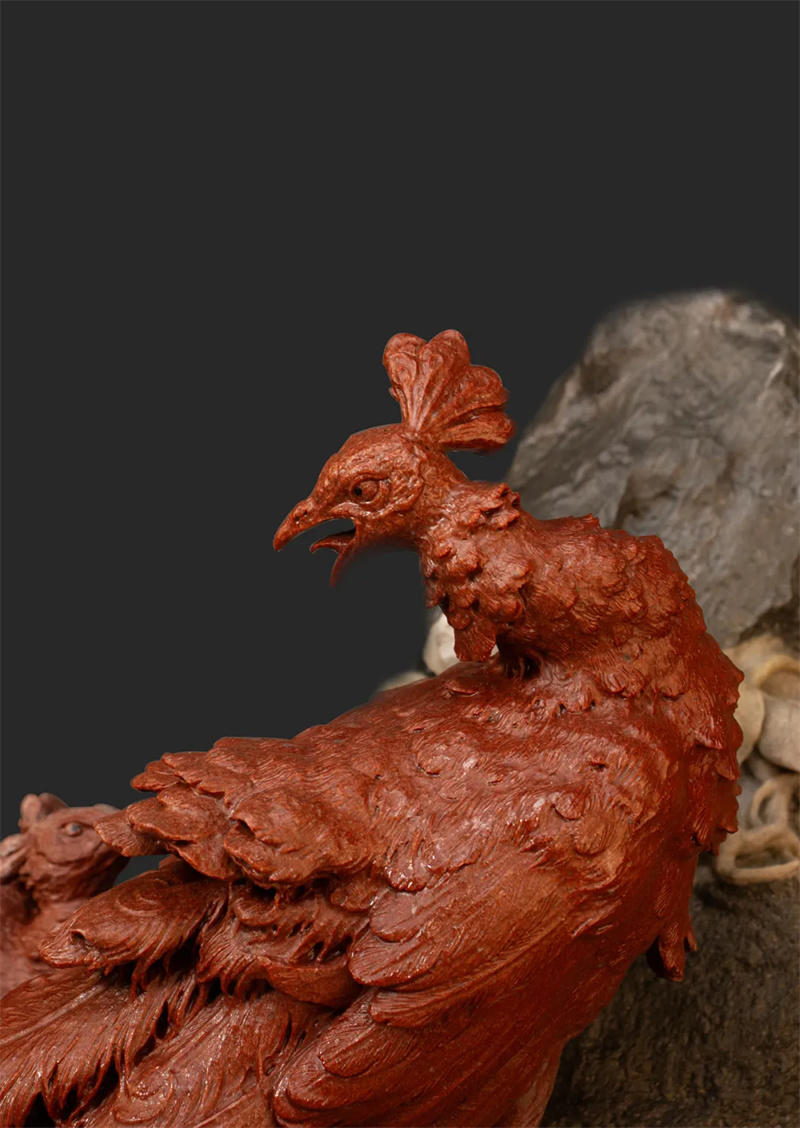兩只孔雀刻劃線條極精細,腳爪張力十足,纖毫畢現,顯示作者極高的雕刻工底和藝術造詣。