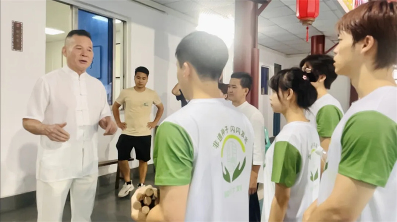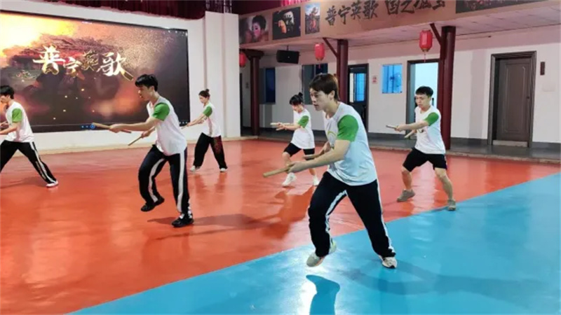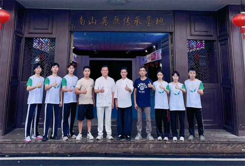 ▲在揭陽普寧南山英歌傳承基地,廣州體育學院武術學院師生在普寧英歌國家級非遺代表性傳承人陳來發的指導下,開展了為期四天的實地教學;