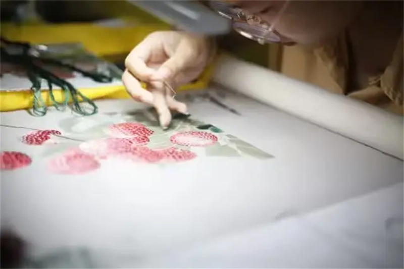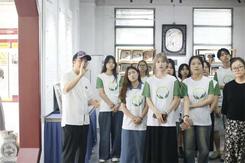 ▲在王新元大師工作室,廣東輕工職業技術大學和廣州美術學院學生通過“基地參觀+理論講解+座談交流+刺繡體驗”,在基地持續開展為期一個月的基礎訓練和專業研修;