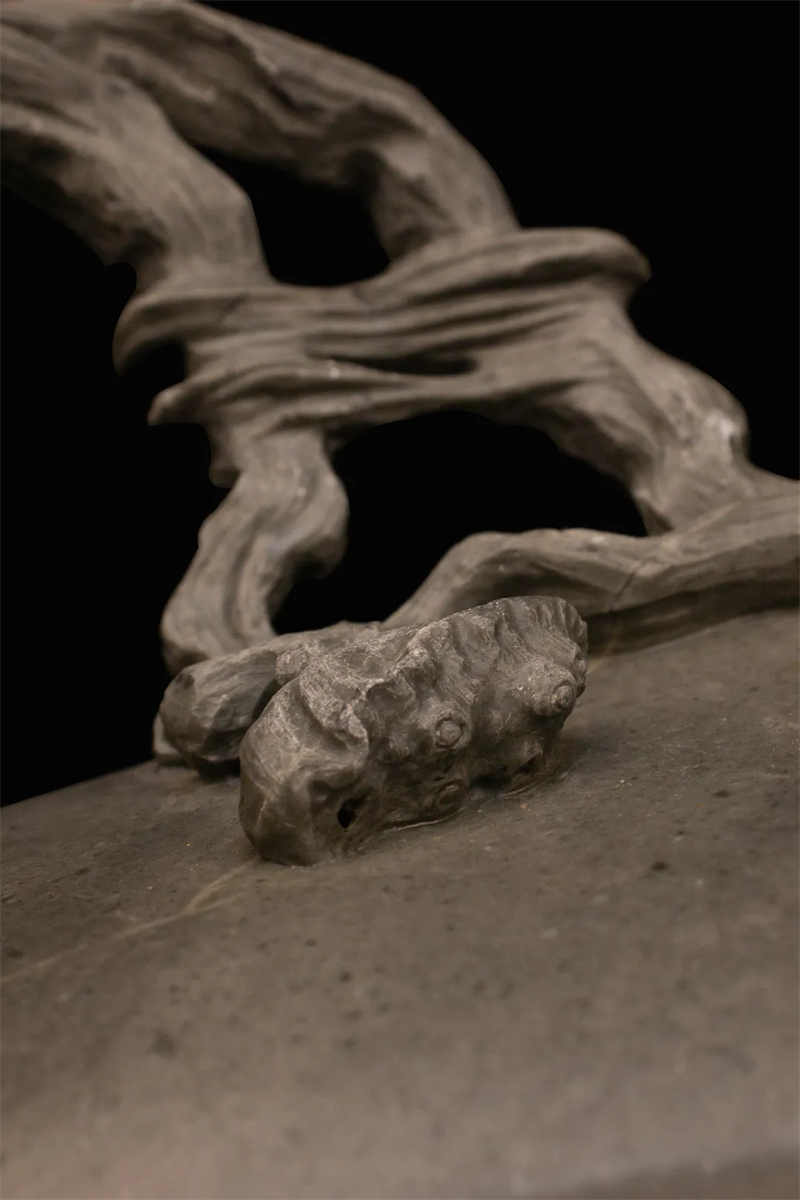 陳禮忠的石雕作品《荷塘清趣》寫意與象征相結(jié)合,構(gòu)圖簡(jiǎn)練而富有意境,獨(dú)立的蒼鷺?biāo)坪踉谒伎贾裁矗苍S是在想念同伴,也許只是單純的吃飽了發(fā)發(fā)呆,也許是想著減肥……畫面給人無限的想象空間,其中的象征意義只能觀者自己去尋找。