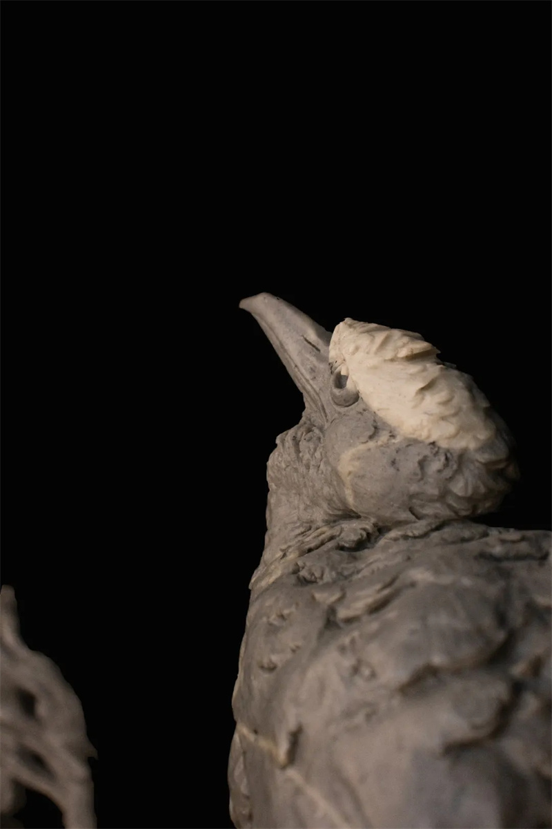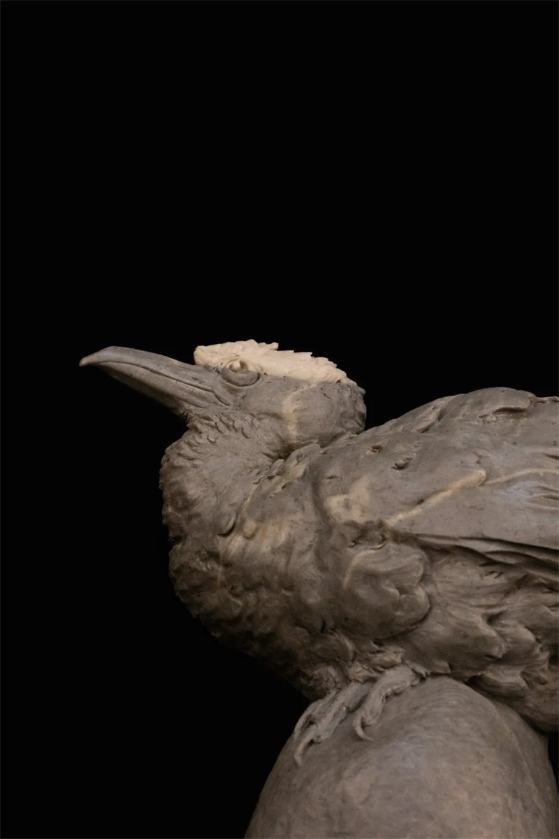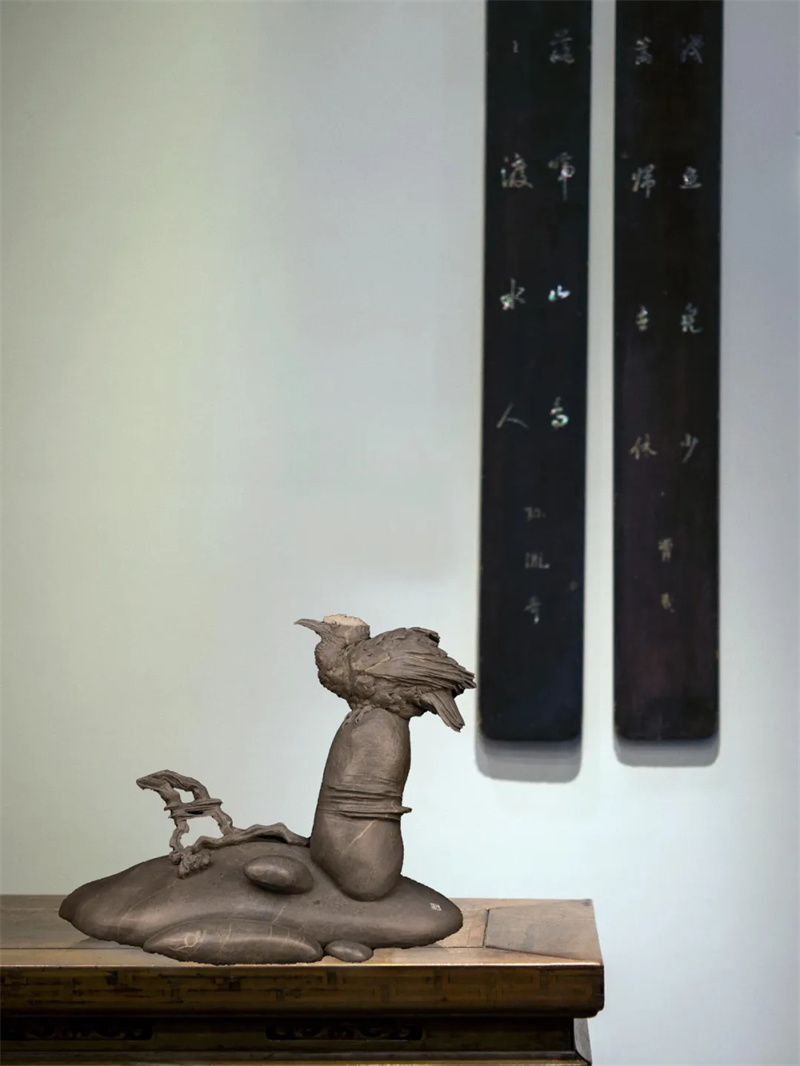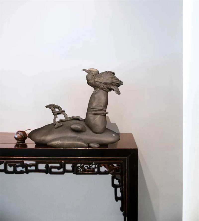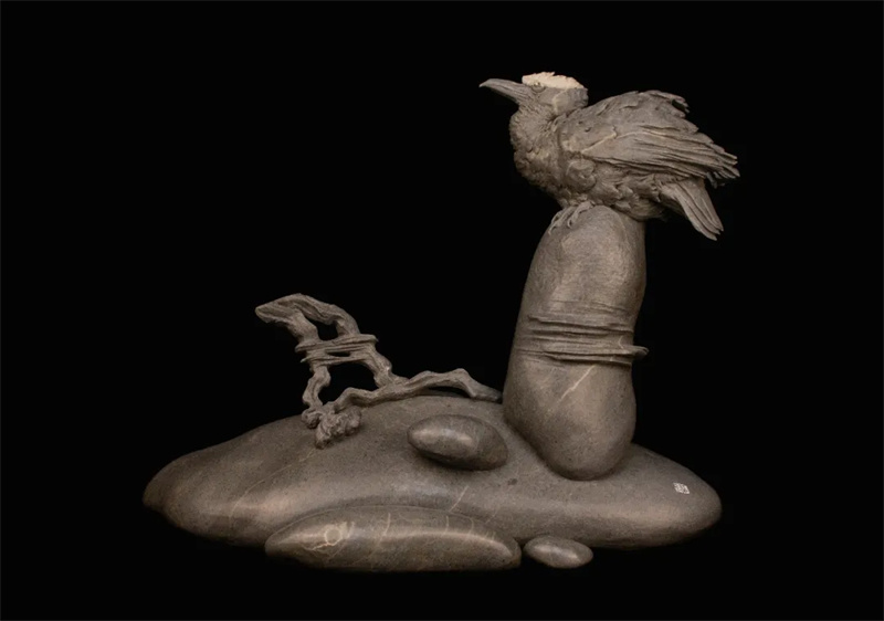 陳禮忠的所創(chuàng)作的鳥兒不僅在形式和技法上表現(xiàn)出真情實(shí)感。他所雕刻的對(duì)象,借鑒了八大山人畫中常常出現(xiàn)的鼓腹的鳥、瞪眼的魚,甚至禽鳥一腳著地,以白眼向青天。