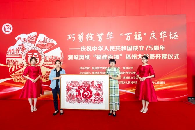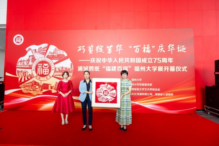 在舉國同慶中華人民共和國成立75周年的喜慶氛圍中,一場國家級非遺的文化藝術盛宴——“巧剪綻芳華 ‘百福’慶華誕”浦城剪紙“福建百福”展,于9月30日在福州大學旗山校區晉江樓開幕,以非遺剪紙技藝描繪福建百福的精神魅力,向祖國華誕獻禮,傳承和弘揚中華優秀傳統文化。