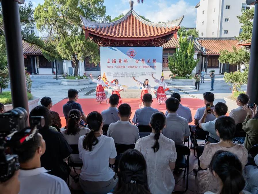 在漳浦縣文學藝術創作交流基地,潘魯生一行觀看了漳浦剪紙表演、陳忠平絕活技藝表演(“演金”)和阿梅木偶戲表演,參觀“三浦并臻·金剪送福”剪紙藝術大展,并與當地民間文藝家進行座談。漳浦剪紙是首批國家級非物質文化遺產擴展項目,作為民間傳統文化最普遍、最具特色的一種傳統習俗,早在唐宋時期就非常活躍。1993年,漳浦縣被文化部授予“中國民間文化藝術(剪紙)之鄉”的稱號。