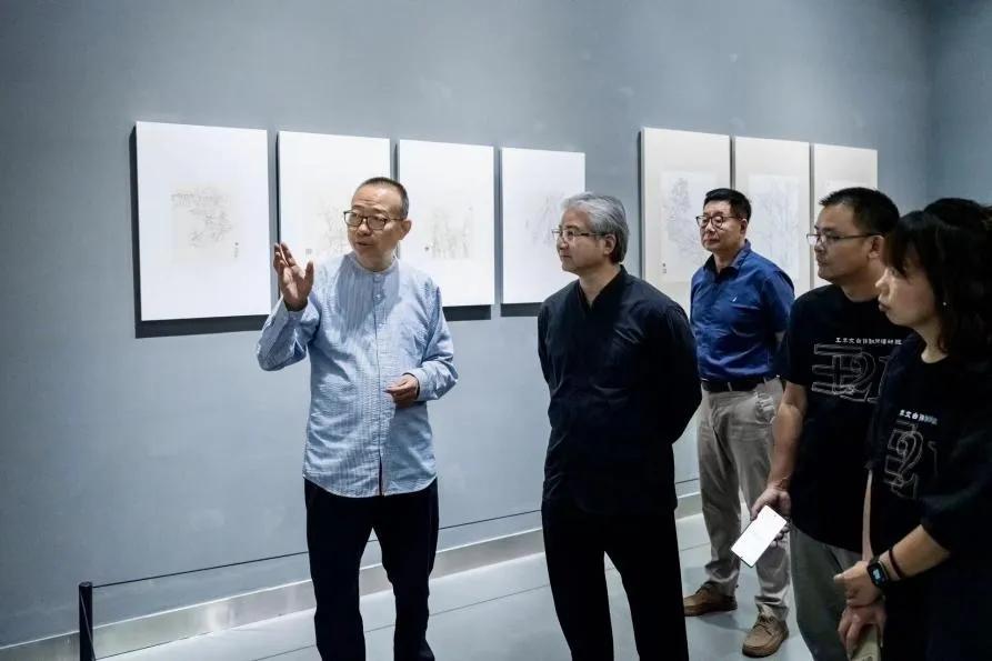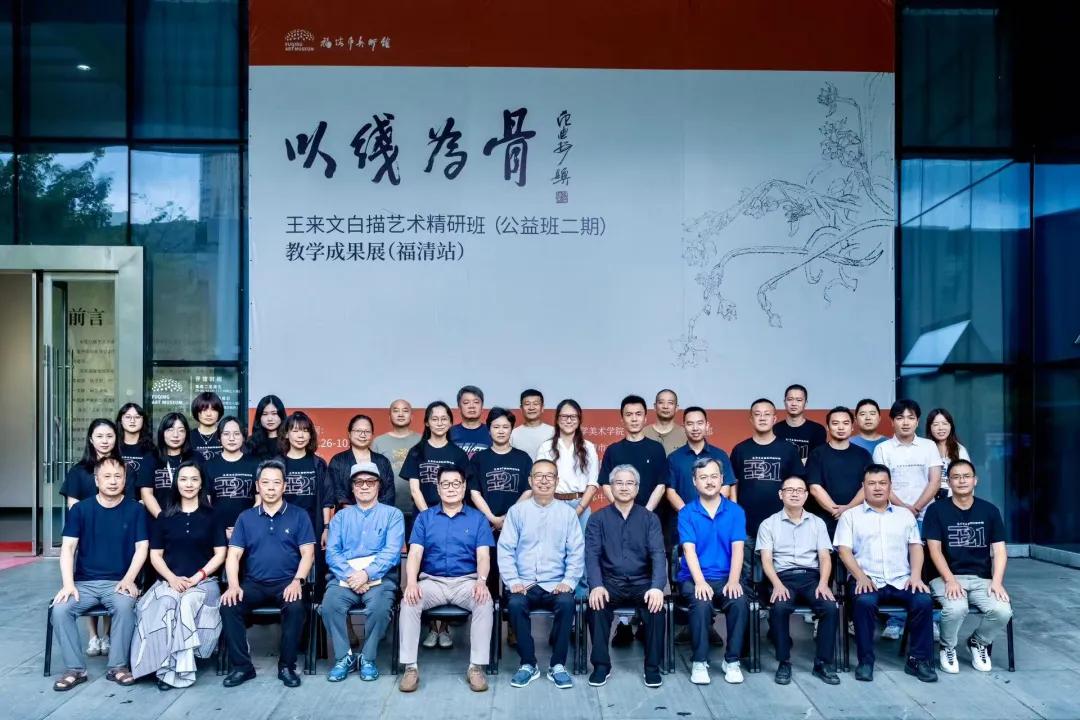 在福清市美術館,潘魯生一行參觀了“以線為骨”王來文白描藝術精研班教學成果展(福清站),并與精研班師生合影。