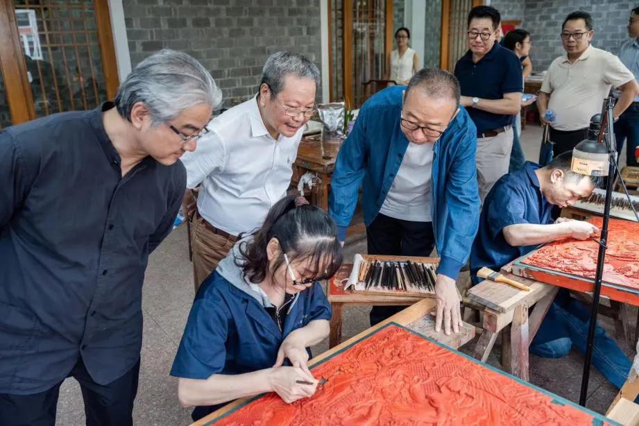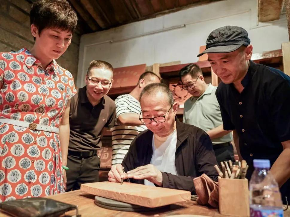 在泉州市木雕藝術研究院,潘魯生調研了泉州木雕技藝。該研究院集“產、學、研、銷”功能為一體,主營生產設計銷售民間傳統木雕工藝品、個性隨形創意藝術品。院長張紅萍從事木雕創作研究30多年,現為國家級非遺代表性傳承人,福建省工藝美術大師。