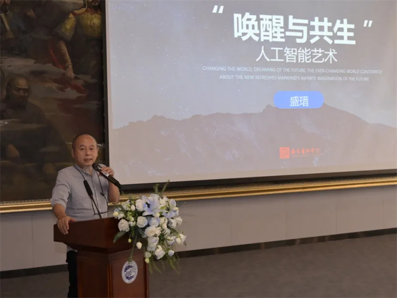 盛瑨以“喚醒與共生—人工智能藝術”為題,著重研討AI工具在藝術創(chuàng)作中的新應用與挑戰(zhàn)。他在現場展示了其與南藝師生作品案例,具體分析AI是如何激發(fā)創(chuàng)造性思維,藝術與科技結合的巨大潛力在哪里。他強調,培養(yǎng)學生審美素養(yǎng)是AI藝術創(chuàng)作的核心要素,設計師和大學教師應緊跟技術進步的步伐。