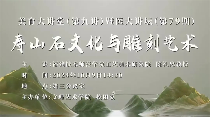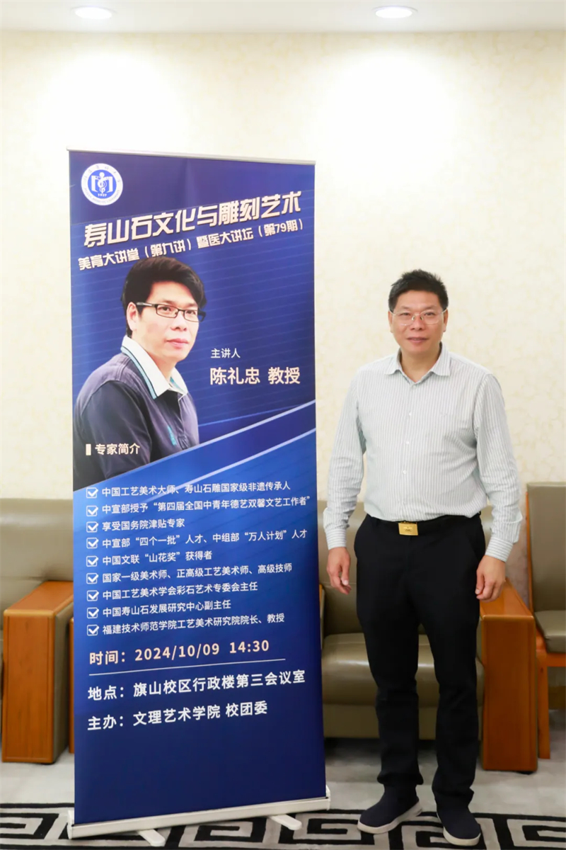 10月9日下午,福建技術師范學院工藝美術研究院與校團委聯合舉辦美育大講堂(第九講)暨醫大講堂(第79期),特邀壽山石雕國家級非遺傳承人、福建技術師范學院工藝美術研究院院長陳禮忠教授作題為“壽山石文化與雕刻藝術”的專題講座,逾200名學生聆聽了講座。