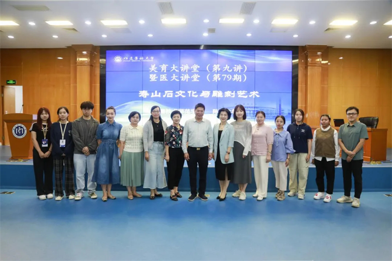 陳禮忠教授從壽山石的形成、分類、歷史淵源、文化價值和地域特色等方面起,介紹了壽山石文化的形成與發展,講述了壽山石雕技藝傳承的故事。陳教授通過展示《碩果累累》《寒冬一霸》《春聲賦》等壽山石雕經典佳作,闡釋其蘊含的文化意義,展現了工藝師“以刀代筆、因材施藝、因色施巧”技藝創新,詮釋了精益求精、薪火相傳的工匠精神。他指出,工匠精神與醫學精神異曲同工,都需要一份興趣、一份堅守、一份熱愛、一份敬業精神,并勉勵醫學生堅守初心、愛崗敬業、持之以恒。