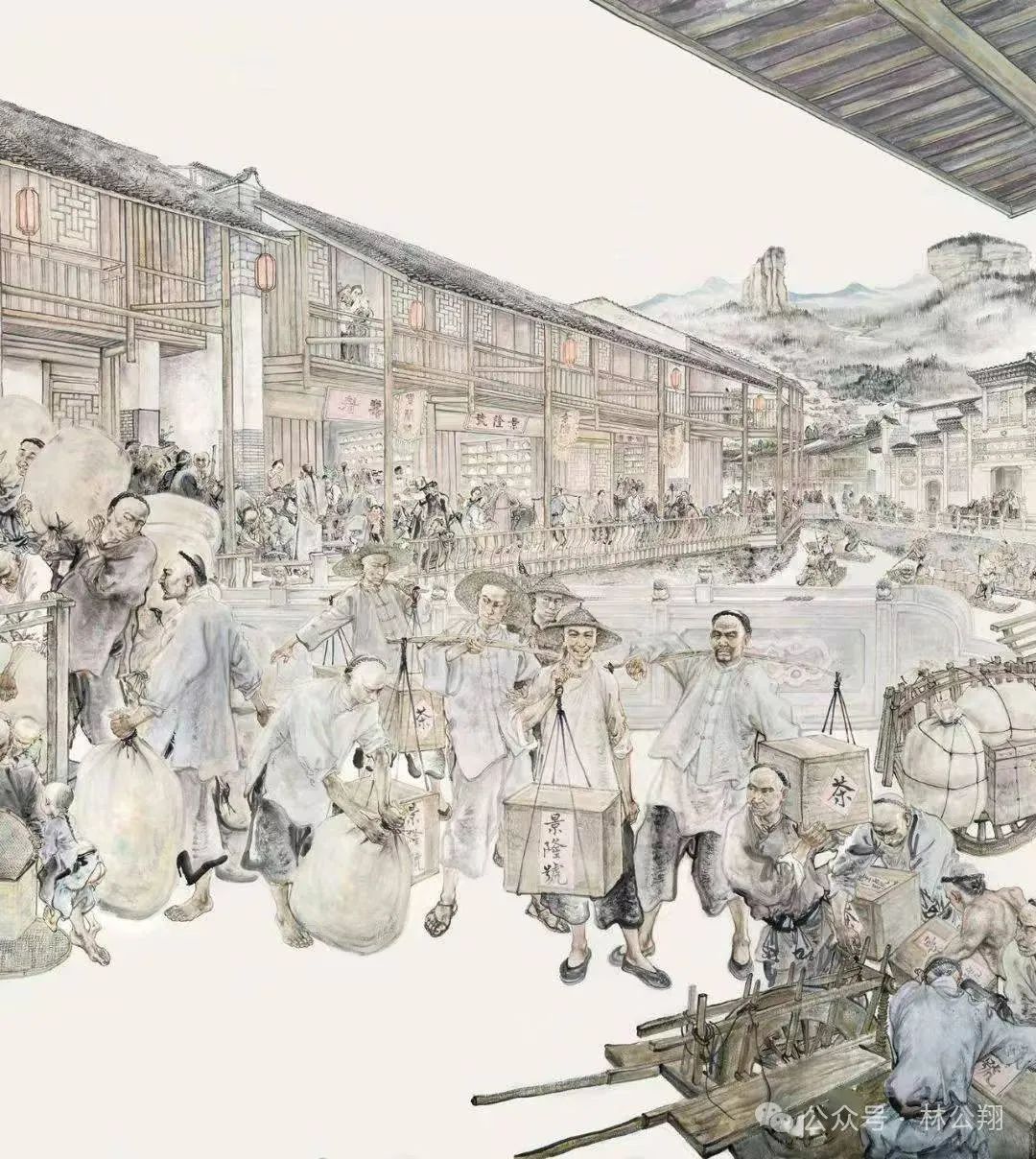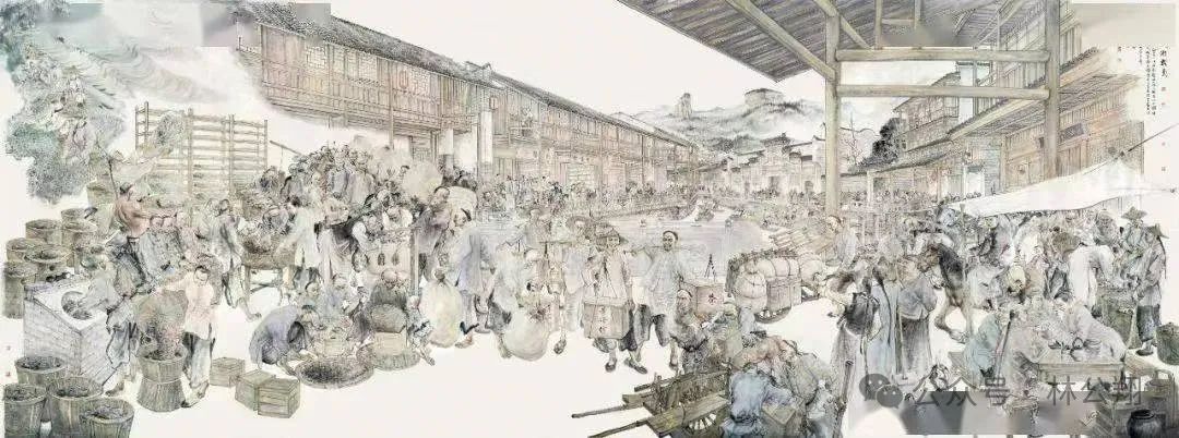 同時,這又是一幅具有生動人物描繪虛實相融的創新畫卷。對人物的精心刻畫與描繪,是一幅巨作的關鍵所在,也往往成為成敗所在。在《萬里茶道溯武夷》中,幾乎囊括了茶行業的所有人物。有采茶的、炒茶的、捻茶的、分茶的、裝茶的、挑茶的、喝茶的、賣茶的、運茶的、談茶的,各色人等,應有盡有。作品以巨大的橫豎梁柱為中心點,以鄒氏家祠和“景隆號”為背景,以梅溪和梅溪上運茶的竹排以及下梅古村落為聚焦點,用散點透視的方法,將萬里茶道的始點人頭攢動、萬商云集、生意興隆的風俗世情表達得淋漓盡致。