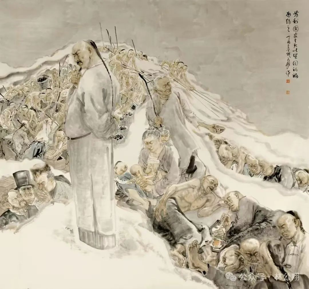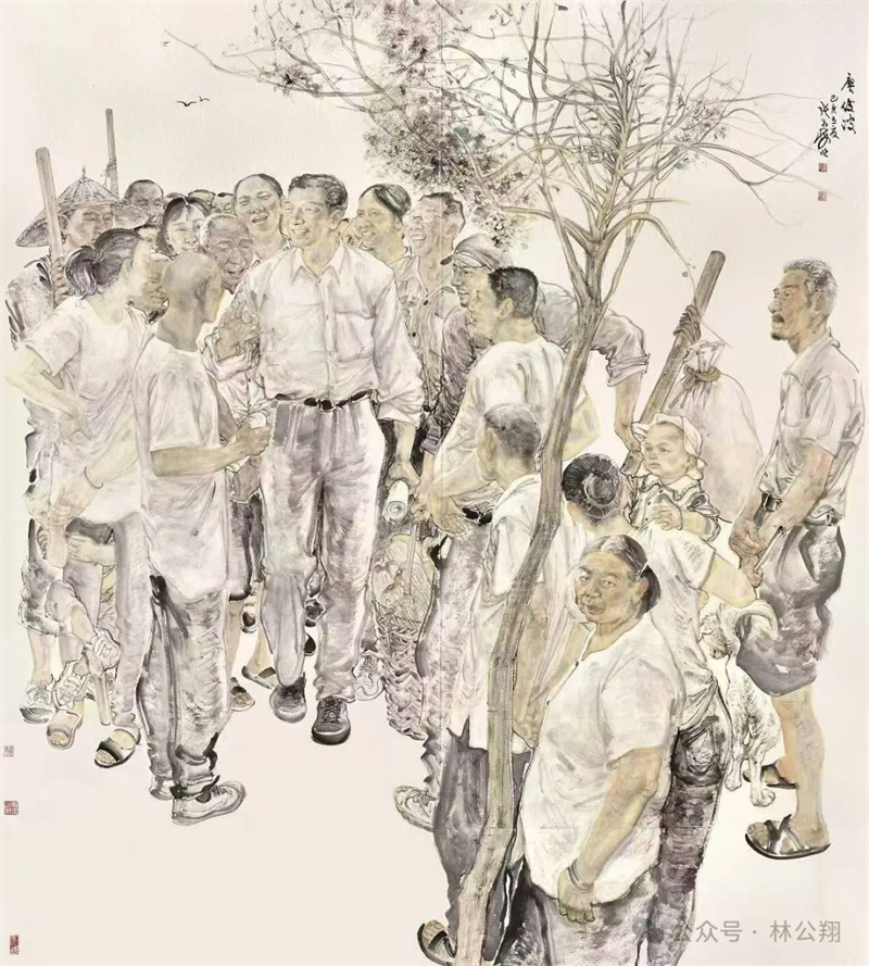 他的作品《林祥謙》同樣是水墨人物畫創作的一幅經典作品。《林祥謙》畫幅尺寸為寬5.1米,高2.5米。畫面人物眾多,被五花大綁在電線桿上的林祥謙氣概豪邁,而揮舞著砍刀、腰上別著撲克槍的一眾軍閥則耀武揚威。寒風習習,工友持援,妻子呼喊,與此形成了巨大反差。遠處的火車和黑壓壓的一片烏云,交代了江漢鐵路工人大罷工的時代背景。作者有意選擇了正面描繪,將林祥謙置于中心位置,對人物進行細致的描繪,使得畫面的主與次、中心與邊緣、正面人物與反面人物有意區別開來。作品在整體布局上以拉近的外部視點進行描繪,視覺中心通過主次關系的設置引向正在吶喊的林祥謙,旁邊人物排布井然有序,刻畫細致入微,烘托了空間的特殊氣氛。