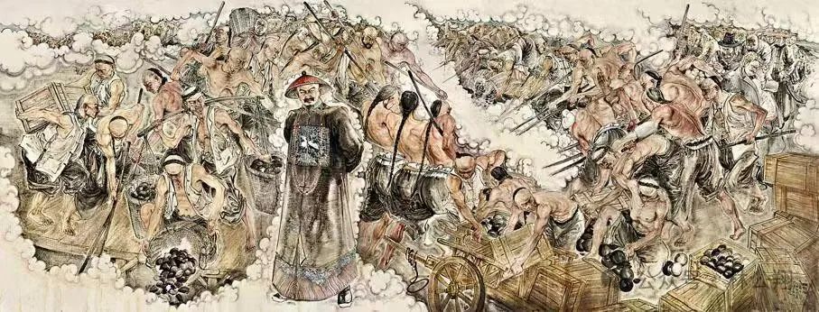 他的作品《林則徐》以恢弘的氣勢展示了當年林則徐虎門銷煙的英雄壯舉。眾所周知,虎門銷煙是中國近代史上重要的歷史事件。欽差大臣林則徐領導的禁煙運動的勝利,維護了中華民族的尊嚴和利益,是中國近代史上反對帝國主義的重要史例,也是人類歷史上曠古未有的壯舉。為了表現林則徐這位被中國人尊為“民族英雄”和被史學界稱為近代中國“開眼看世界的第一人”的光輝形象,張永海在創作前期做了大量的準備工作,特別是對林則徐的一生經歷做了很多案頭工作。在山字形的背景上,人物眾多,有各式各樣留著長辮子、吸食鴉片、東倒西歪的男人,有懷抱嬰兒正在哺乳的婦女,有戴著禮帽、竊竊私語的洋人,中心偏左位置的林則徐則大義凜然,背景是大面積的灰蒙蒙的天空,象征民智未開啟的近代中國。這幅作品人物栩栩如生,逼真傳神,富有穿透歷史的厚重感。以背景人物襯托主要人物的構圖方式,傳達出穩定開闊的視覺特征。從作品近景向遠景的推移嚴格遵循空間的透視法則,作者以極其扎實的寫實功力傳達出歷史題材繪畫的巨大魅力。由于藝術手法的高超和題材的焦點性質,這幅作品成為同類題材作品里影響很大的一件。