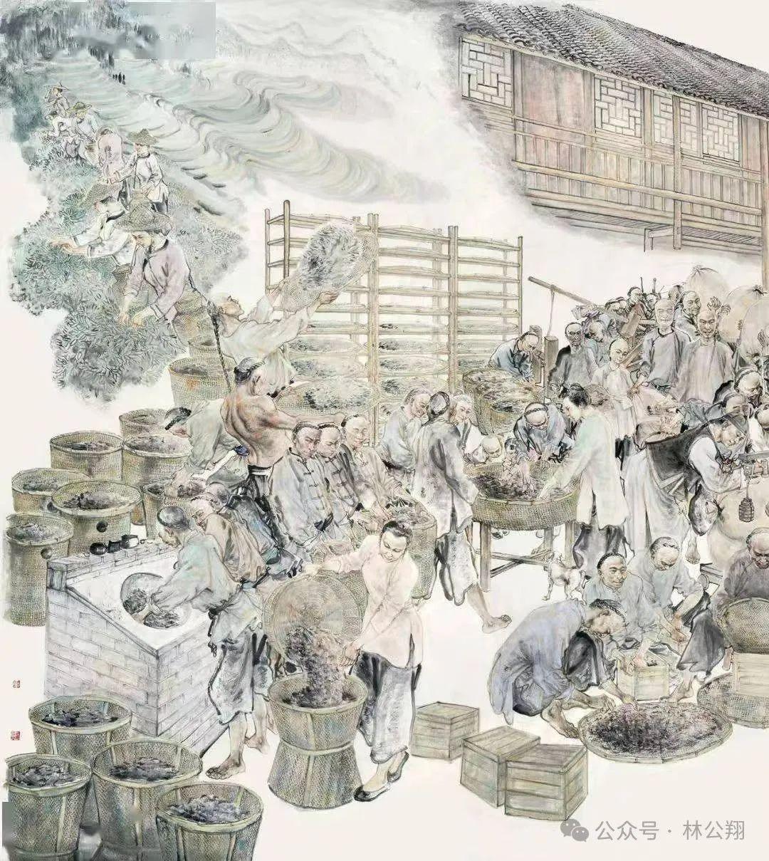 這幅巨作分組式突出了采茶、制茶、炒茶、捻茶、裝茶、茶葉交易、茶葉運輸、中外交流等過程,突出了作為“萬里茶道”起點重要象征的鄒氏家祠,突出了武夷山下梅村和梅溪,突出了武夷山最具象征意味的大王峰和玉女峰,并且通過250多個人物將這些分散的元素組織成一個宏大的敘事場景。