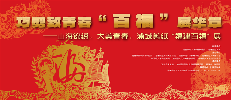 “福文化”主題呈現八閩山海魅力,非遺技藝剪刻中國故事的福建篇章。2024年11月6日-11月12日,由福建師范大學主辦的國家級非遺浦城剪紙作品《福建百福圖》展覽將在福建師范大學旗山校區又玄圖書館二樓大廳展出,以《福建百福圖》系列剪紙作品陳述閩越的千年競風流,傳遞中華民族福建人民的文化自信。開幕儀式現場特邀浦城剪紙非物質文化傳承人周冬梅團隊現場教授剪紙技藝,并與觀眾進行互動。