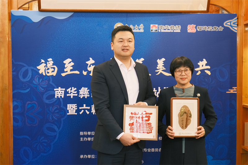 隨后,活動進行了互贈創作作品環節,全國“三八”紅旗手、國家級非遺浦城剪紙代表性傳承人周冬梅,精巧運用福文化專家陳吉“多一點福”書法作品創作“福至東南”標識,贏得贊譽。東南大學發展委員會副主任,教育基金秘書長芮振華代表學校贈送東大杯南華彝繡第一屆大賽獲獎作品“六朝松”。